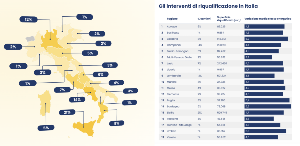 Il Mezzogiorno guida la riqualificazione, con il 61,6% dei cantieri italiani, in particolare Sicilia, Campania e Calabria. In termini di superficie riqualificata, Sicilia e Lombardia primeggiano con oltre 500.000 mq ciascuna. La Sardegna registra il salto medio più alto di 5,6 classi, seguita da Puglia e Calabria, mentre Friuli Venezia Giulia, Toscana e Lombardia mostrano miglioramenti più contenuti.
