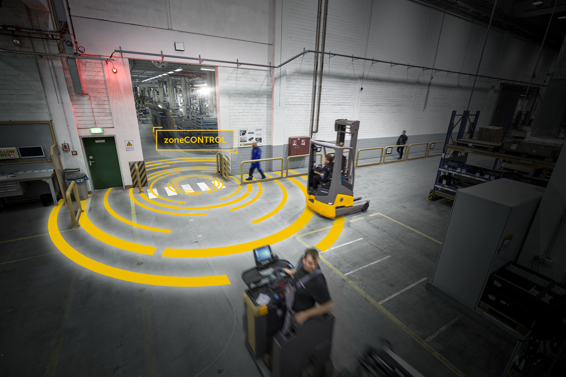 Il sistema ZoneControl impone regole restrittive al transito dei carrelli nelle aree critiche di magazzino quali le zone pedonali o incroci ad elevato rischio collisione. Le tecnologie ZoneControl attivano degli alert visivi e sonori per avvertire gli operatori che un carrello sta entrando in una zona non autorizzata o impongono al carrello una diminuzione automatica della velocità di transito.