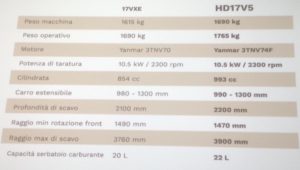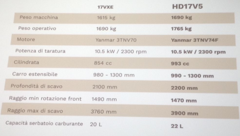 I nuovi escavatori V5 monteranno motori endotermici, più potenti e più puliti, Yanmar e Kubota. La nuova serie promette produttività aumentata e maggiore flessibilità d’impiego. L’HD17 V5 della classe 1-2 ton ha una profondità di scavo aumentata di 10 cm, postazione ergonomica per l’operatore, nuovo sedile Grammar e nuovo cruscotto con contaore digitale.