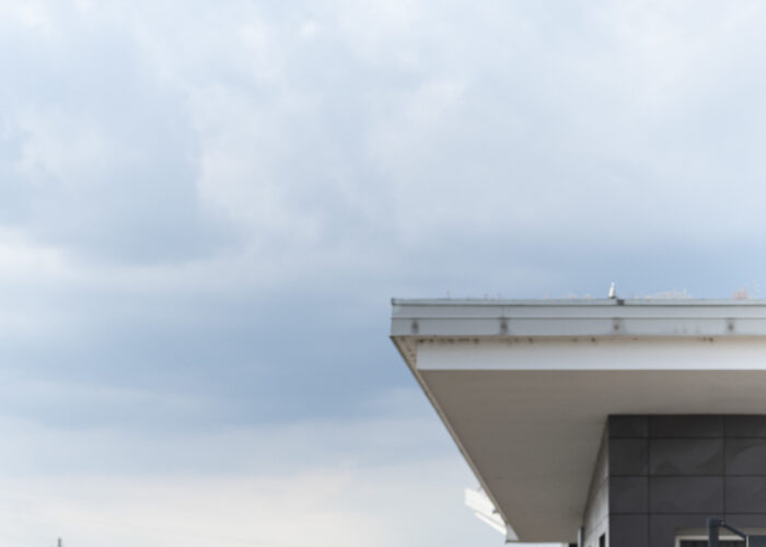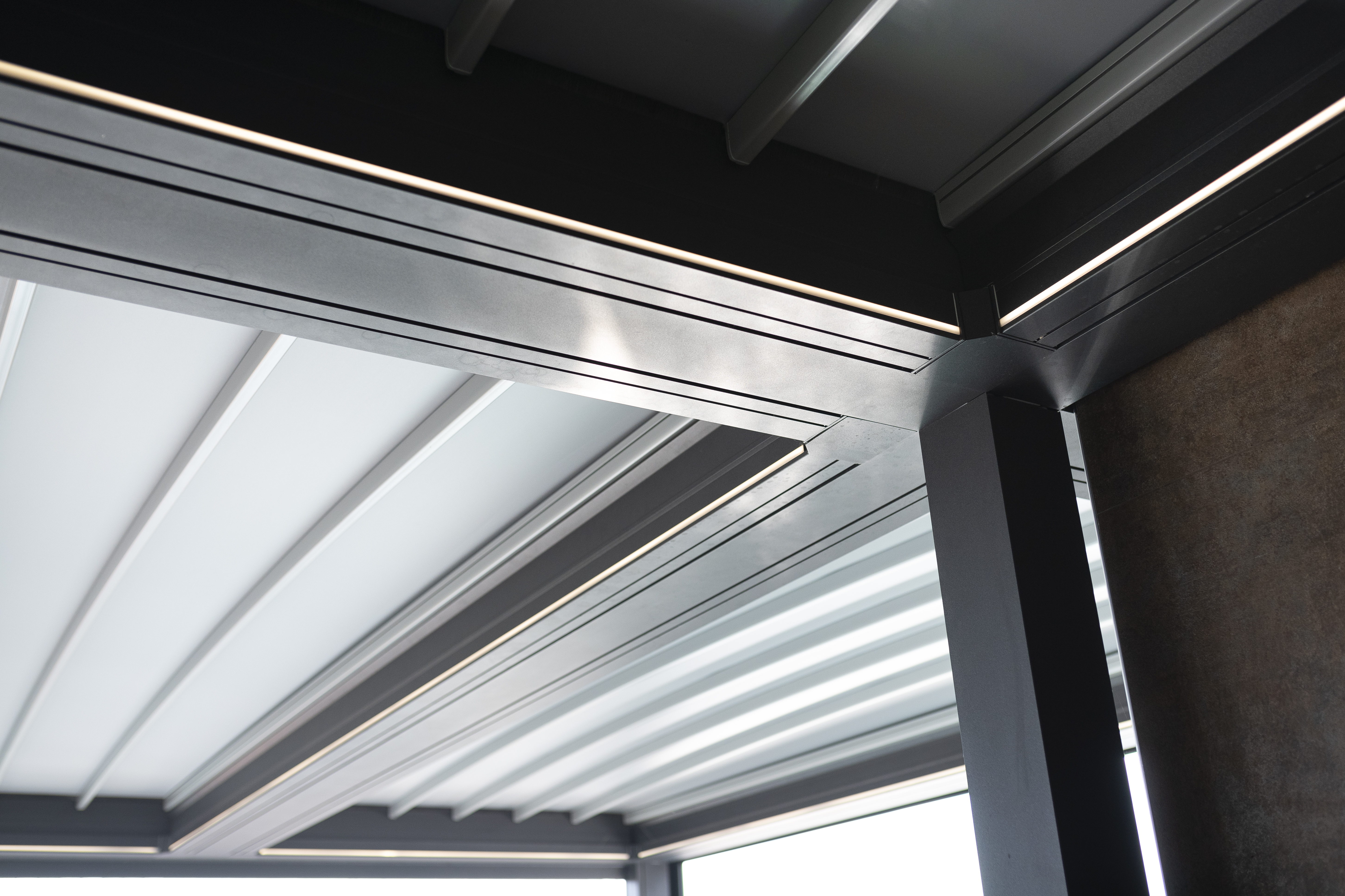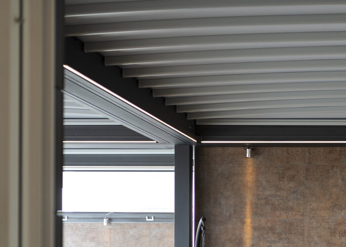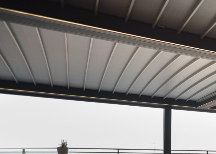 L’edificio si trova in un contesto ultra moderno e il progetto risulta di grandissimo impatto. Proprio il contesto architettonico moderno si è dimostrato perfetto per la collocazione di tre pergole a telo retrattile parallelo al pavimento, corredate da chiusure in pvc Cristal e luci led perimetrali, modello Isola 3 di KE. I colori grigio antracite della struttura ed il grigio chiaro Vintage dalla vocazione tessile del telo si armonizzano perfettamente con i rivestimenti in Corten scelti per le pareti, con le luci soffuse a faretto e con gli arredi in stile industrial.