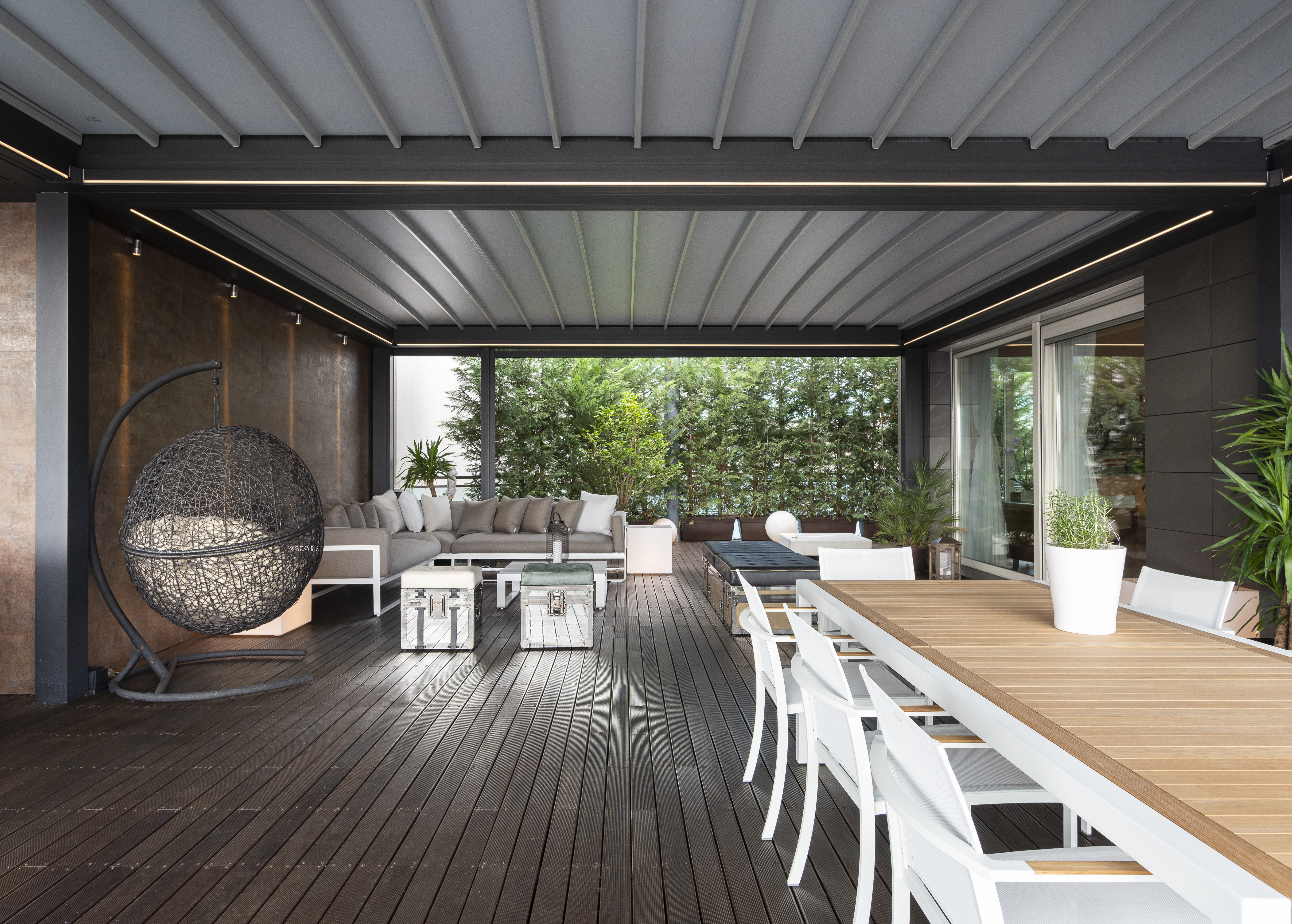 Grazie alle tende perimetrali in pvc Cristal questi ambienti possono essere utilizzati anche in condizioni di pioggia, di vento o di freddo e quindi il progetto così creato rappresenta un vero continuum con la casa.