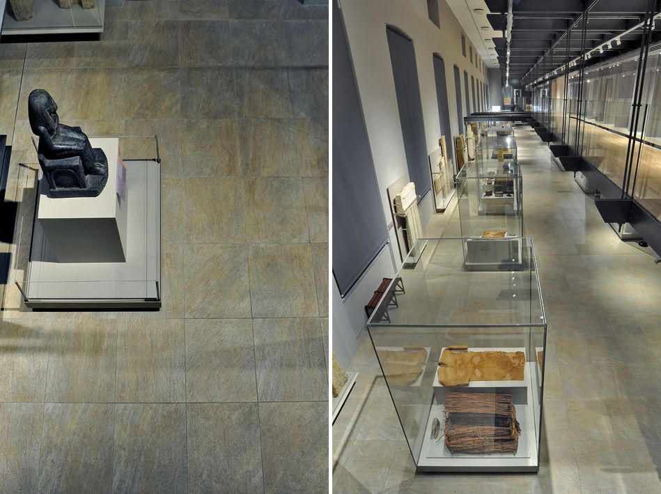Grazie al design di In&Out Percorsi Extra, che richiama le suggestive ed eterogenee cromie minerali della pietra, i progettisti hanno potuto realizzare una pavimentazione dall’effetto completamente naturale, in grado di integrarsi alla perfezione con l’atmosfera del Museo, che accompagna i visitatori in lungo viaggio nel tempo, dal 4000 a.C. al 700 d.C.