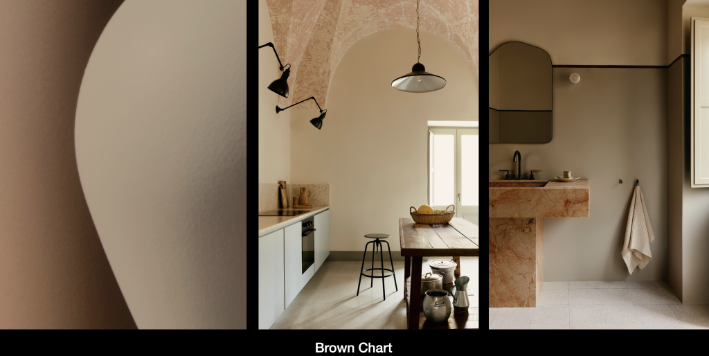 La Brown Chart celebra le radici della terra e la ricchezza dei materiali organici. Le sue tonalità calde e terrose richiamano le venature del legno, i tessuti naturali, i metalli ossidati e le sfumature dei terreni argillosi. È una palette che comunica solidità, accoglienza e autenticità. Nelle architetture contemporanee, questi marroni sofisticati diventano un codice visivo che trasmette comfort e connessione con la materia.