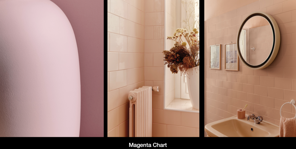 Intensa, vibrante e magnetica, la Magenta Chart rappresenta l’anima più creativa e sperimentale del progetto. La sua ambivalenza tra rosso e viola genera colori che catturano lo sguardo e definiscono l’atmosfera. È una gamma di forte impatto visivo, ideale per chi desidera conferire personalità e dinamismo agli spazi. Nelle applicazioni architettoniche, i magenta di Kerakoll diventano accenti cromatici capaci di esprimere energia e contemporaneità.