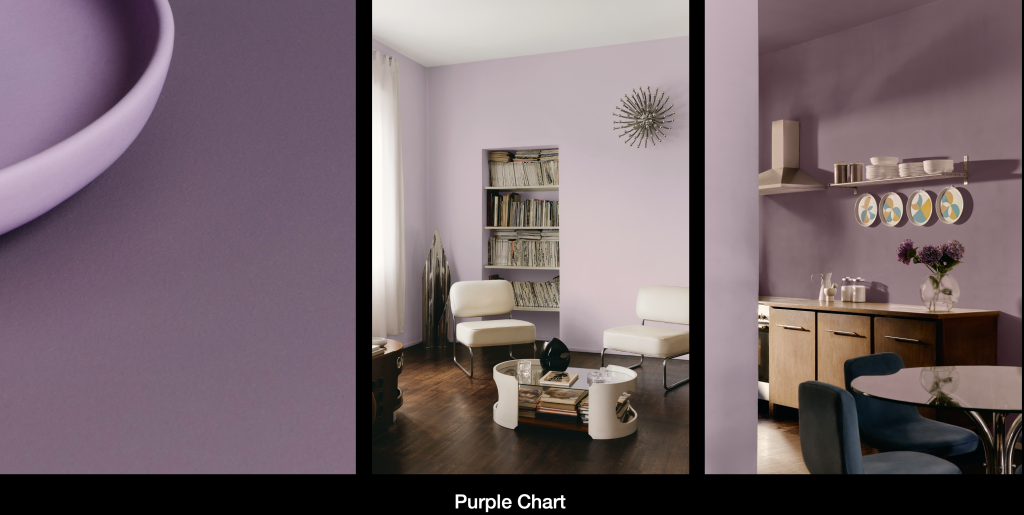 La Purple Chart chiude l’universo cromatico con tonalità cariche di significato simbolico. Sintesi perfetta tra la passione del rosso e la quiete del blu, il viola rappresenta equilibrio, introspezione e creatività. Le sue sfumature, dal lilla polveroso al porpora profondo, invitano alla riflessione e al comfort visivo, donando agli spazi un’aura sofisticata e contemplativa.