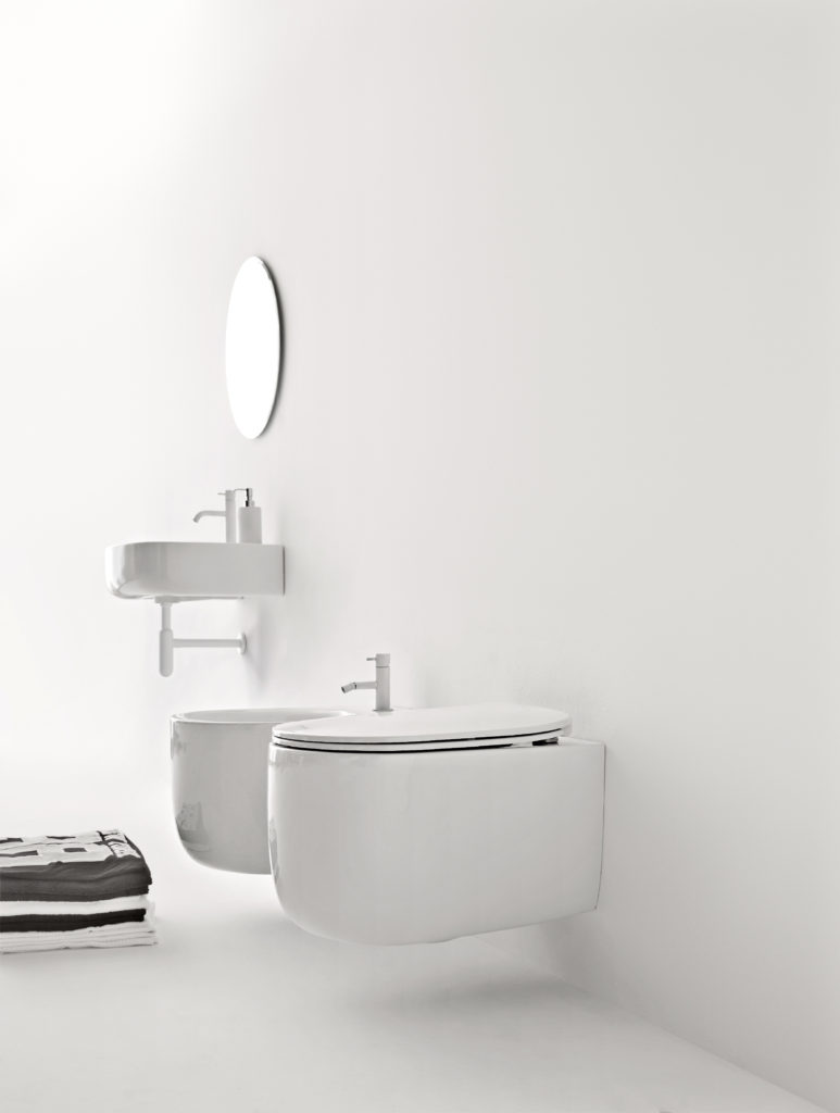 I sanitari sono disponibili nelle versioni sospesa e a terra. Il wc senza brida integra la tecnologia Norim che riduce l’utilizzo di acqua a soli 3 o 4,5 litri.