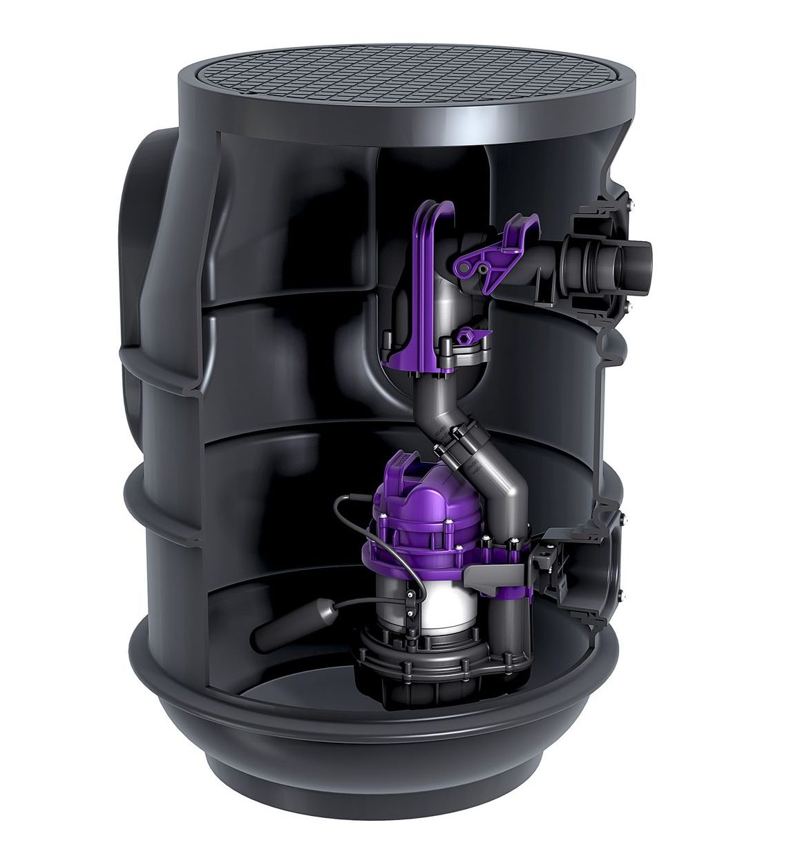 Nel caso in cui il canale fognario si trovi a un livello superiore rispetto al piano interessato, il sistema Aqualift F Basic di Kessel pompa le acque reflue al di sopra del livello di ristagno; le acque di scarico fluiscono naturalmente verso il pozzetto di raccolta e sono spinte dalla potente pompa con girante libera verso il canale fognario.