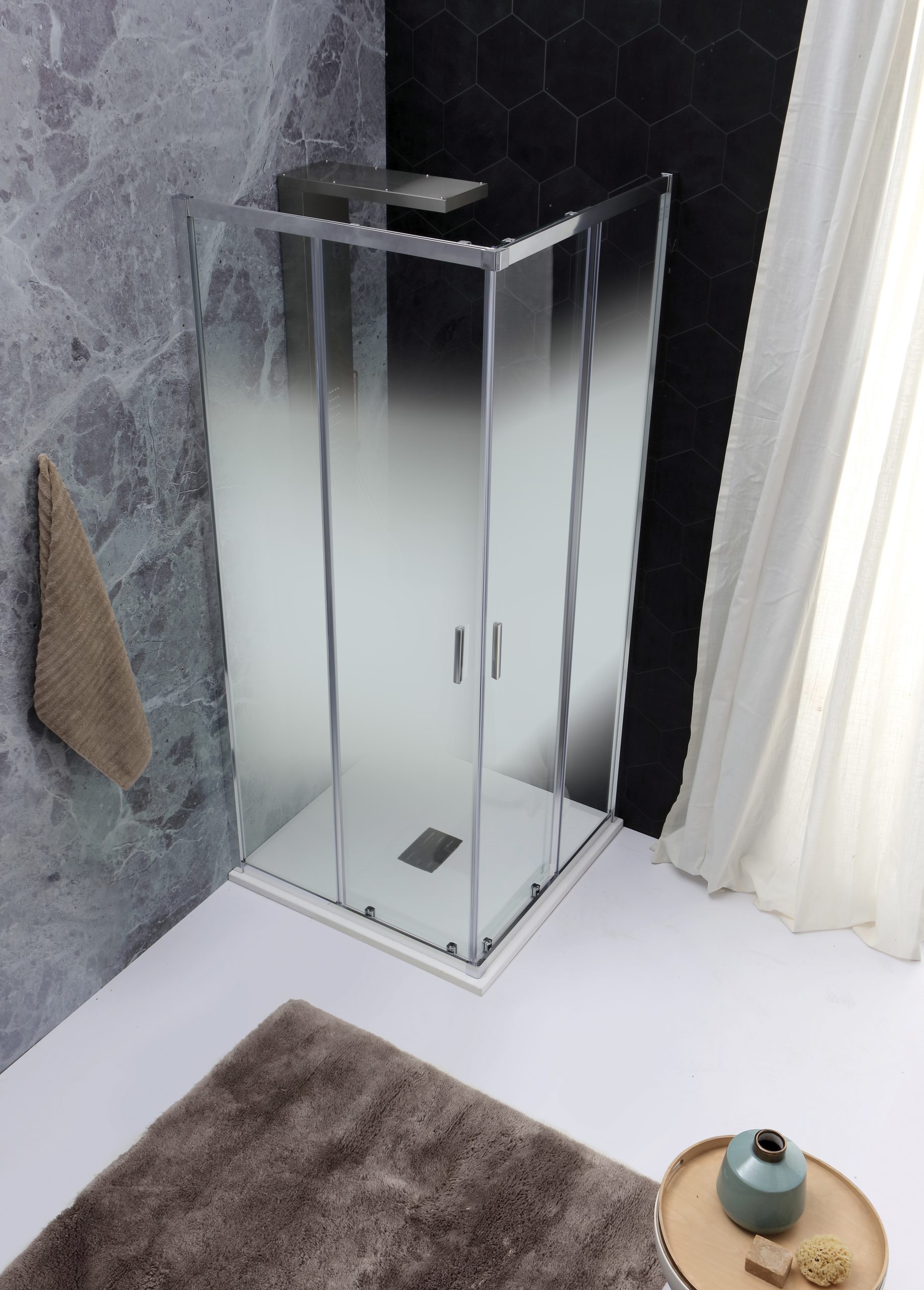 Fast Plus è realizzata in alluminio e ha cristalli di 6 mm, con un’altezza di 200 cm. La gamma include modelli con porte scorrevoli.