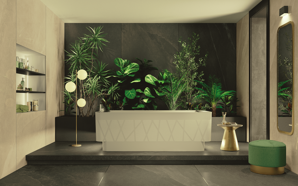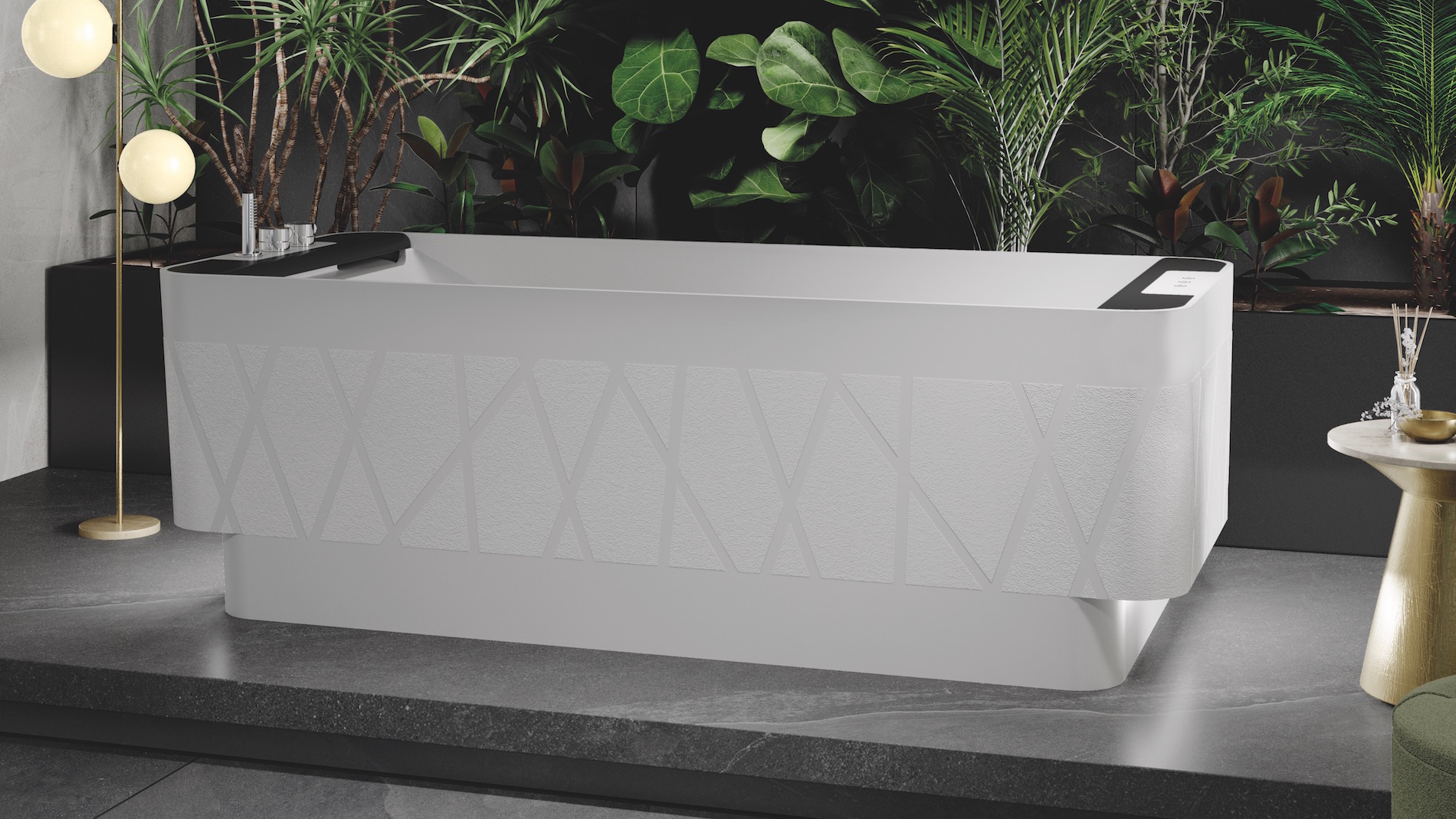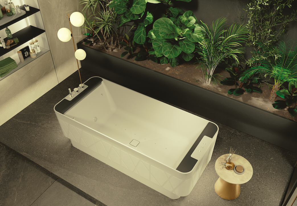 La nuova vasca Glamour di Kinedo si presenta con una decorazione a mosaico continua lungo tutto il perimetro esterno.