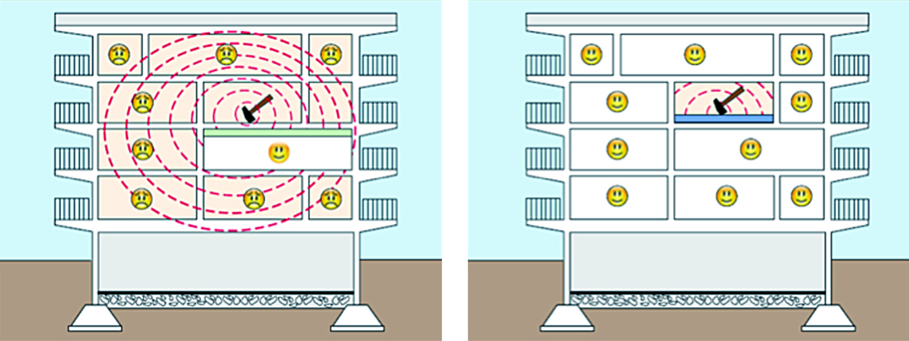 Il fastidio causato da calpestio, caduta di oggetti, spostamento di mobili, voci umane o elettrodomestici può essere decisamente elevato per chi si trova ai piani inferiori o in locali adiacenti, tanto che la legge ne fissa i livelli massimi in funzione della destinazione d’uso dei locali suddetti. Ostacolare la diffusione dei rumori però è soprattutto un vantaggio per il proprietario del locale perché il livello di isolamento acustico concorre alla classificazione di ogni edificio in base a un indice definito dalla norma Uni 11367 e, analogamente alla classificazione energetica degli edifici, contribuisce a determinarne il valore di mercato, assicurando vantaggi economici tanto più sostanziosi quanto migliori sono le prestazioni di isolamento del sistema.
