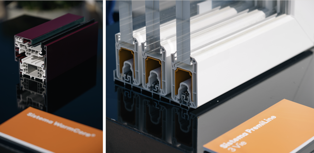 Molto apprezzata anche la nuova anta slim WarmCore, esposta accanto a modelli come la portafinestra color vino e la finestra 76 MD Silicio con cassonetto coordinato.