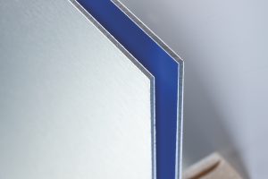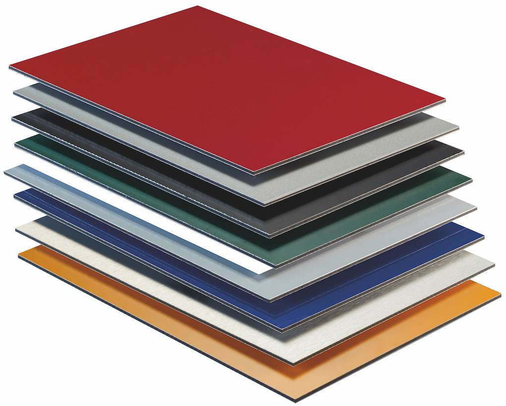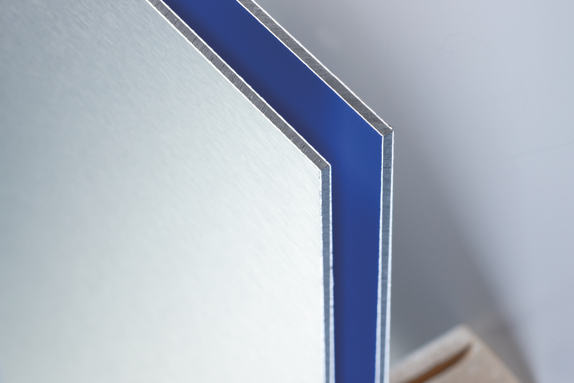 Le lastre composite KömaAlu presentano una classica struttura a sandwich, in cui l’anima di polietilene interna viene incorporata tra due coperture di alluminio. Gli strati sono incollati l’uno all’altro con un adesivo temperato in una produzione continua.