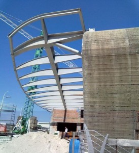 L’ipotesi si è basata sulla realizzazione di una unica grande trave a sezione a H dell’altezza di cm 55, della lunghezza di m 21.80, interessante l’intera area da coprire, ancorata all’estremo nord a una costolatura lievemente ricurva a seguire la geometria della struttura metallica, ivi incastrata nella struttura in c.a. e all’estremo sud a un puntone diagonale trafilato, a sezione circolare fi 200, di spessore mm 25, saldato ad una colonna He-m 250, gettata nell’ultimo pilastro circolare in c.a. esterno, di sezione fi 500, rivestito da tubolare in acciaio inox a vista.