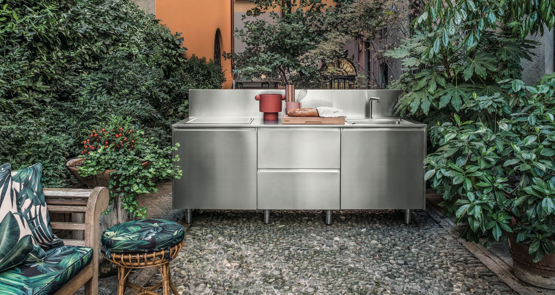 Atelier, nella sua configurazione per esterni, enfatizza il valore dell’atto del cucinare anche en plein air, suggerendo non solo una nuova modalità di personalizzare gli scenari outdoor, ma di vivere la cucina contemporanea come luogo di una socialità ritrovata. La sua composizione è interamente in acciaio inox, lega che rende la cucina resistente a variazioni di temperatura, intemperie o a danni da corrosione ambientale.
