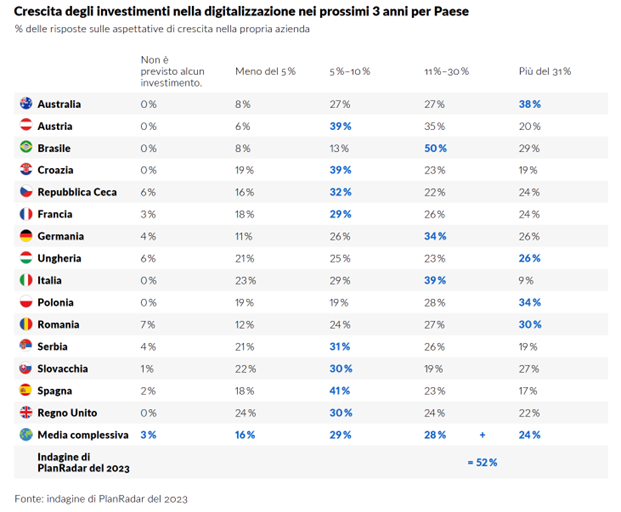 Il settore immobiliare e dell’edilizia sembra essere impegnato a incrementare gli investimenti in tecnologia, come sottolineato dalla quasi totalità (97%) degli oltre 1.300 professionisti intervistati che ha dichiarato di voler aumentare gli investimenti in digitalizzazione nei prossimi tre anni.