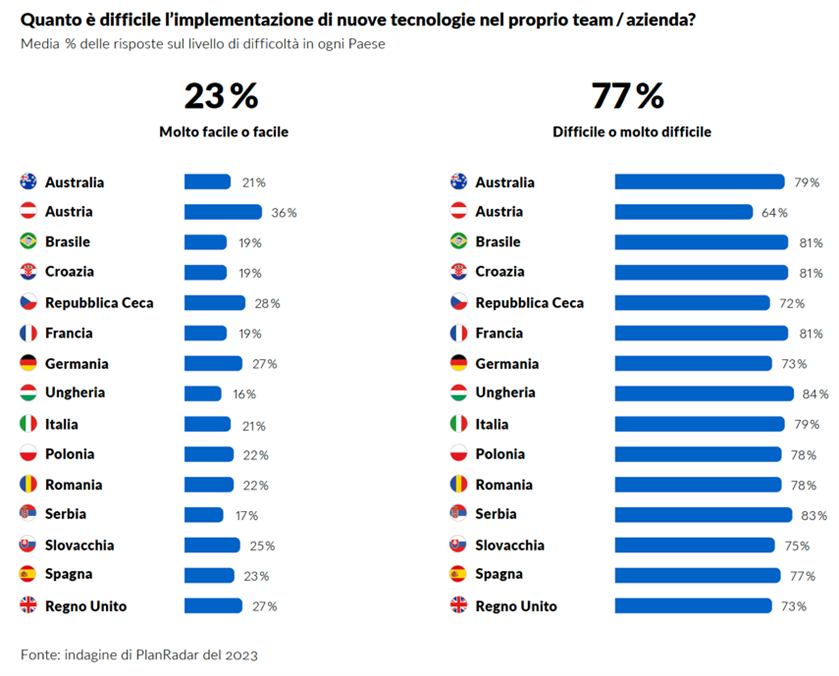 Il secondo maggiore ostacolo messo in evidenza dall’analisi di PlanRadar è la visione troppo tradizionalista dei diversi partecipanti a un progetto di costruzione che, secondo il 20% dei professionisti intervistati in Italia, rallenta l’introduzione e gli investimenti in nuove tecnologie. Questa idea è condivisa dalla maggioranza dei 15 Paesi analizzati (Brasile, Repubblica Ceca, Polonia, Romania, Serbia, Slovacchia, Spagna e Regno Unito) e rappresenta una delle maggiori difficoltà nel percorso di digitalizzazione delle aziende.