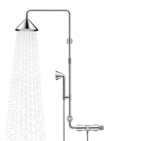 Nella versione più completa il kit permette di rinnovare completamente l’angolo doccia con un soffione ad altezza regolabile, il supporto per la doccetta manuale e un innovativo corpo rubinetteria che permette di selezionare la temperatura da una manopola e attivare i flussi (anche contemporaneamente) di soffione e doccetta attraverso due manopole posizionate in modo intuitivo direttamente in relazione all’uno o all’altra. Il pratico “cono” che caratterizza la forma del soffione può essere afferrato e orientato manualmente a 360° per indirizzare il getto o spostarlo in fase di apertura dell’acqua. Dispone inoltre di un tasto centrale per il cambio del getto da normale a pioggia a aerato e soffice.