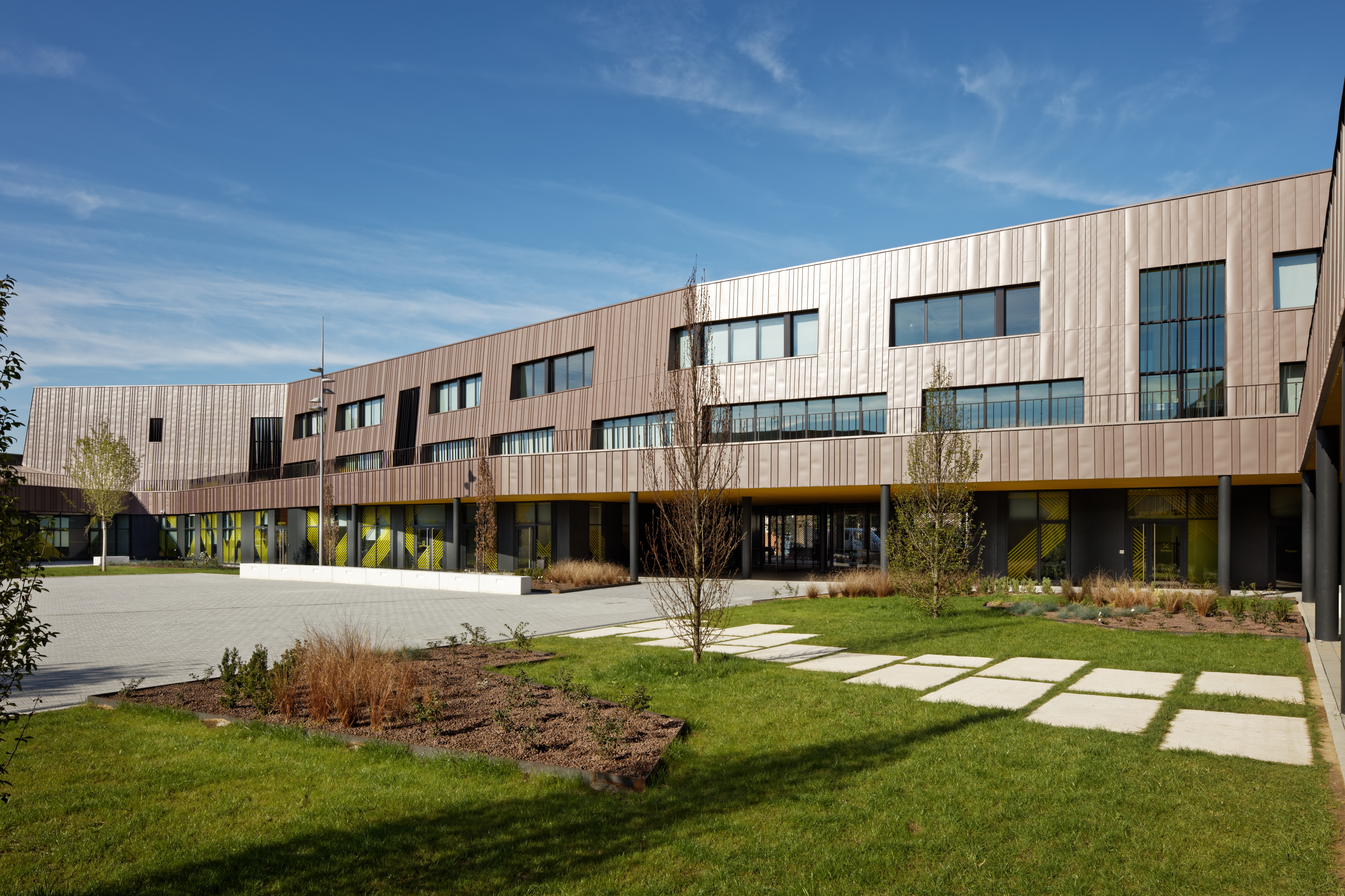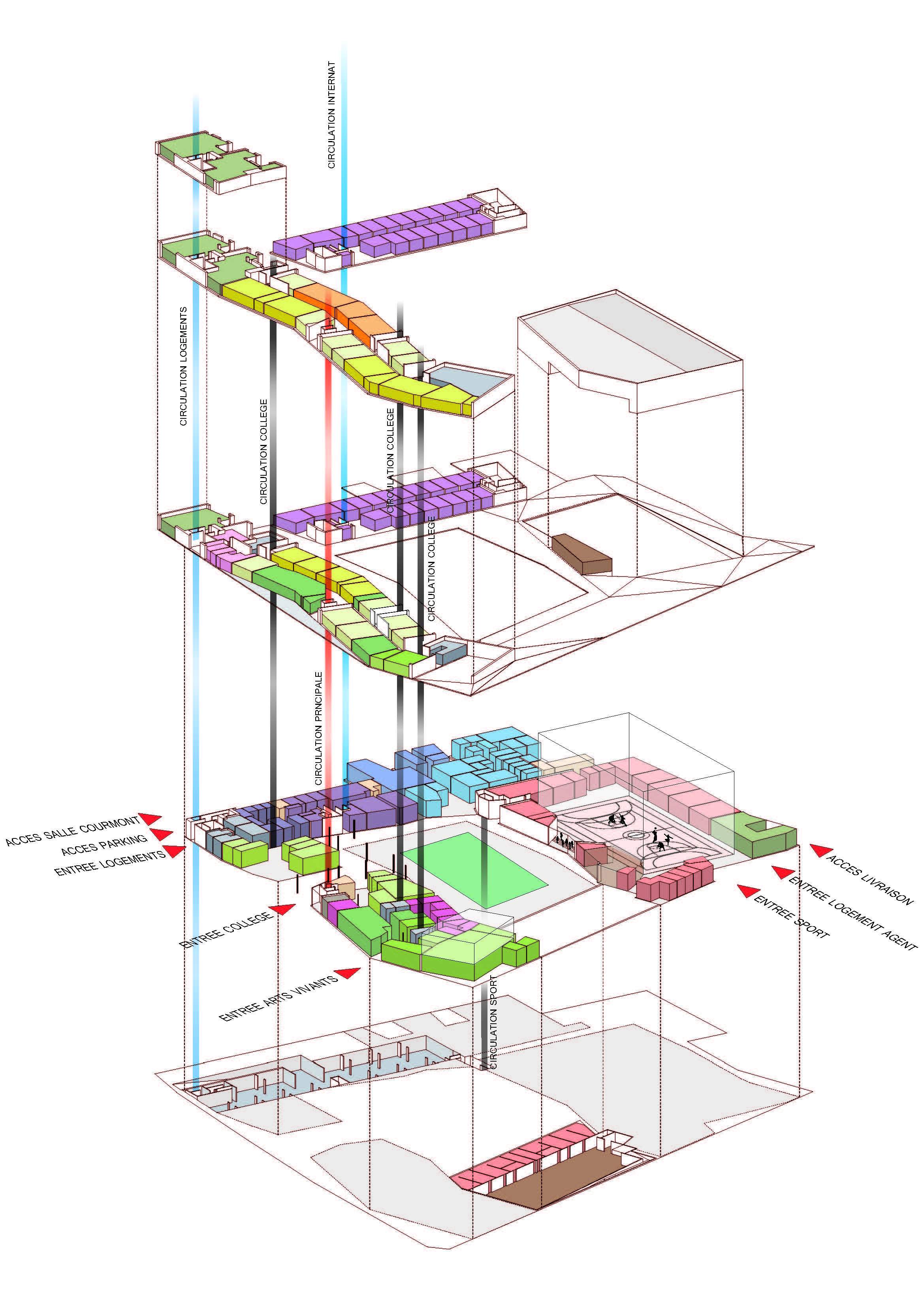 La struttura è situata all’angolo di boulevard d’Alsace e si estende lungo rue d’Arras. Aprendosi in modo naturale verso il quartiere, il sito scelto per la nuova costruzione ha richiesto una doppia scala d’intervento: da una parte, il complesso scolastico e sportivo doveva essere percepito da lontano con le sue masse e le sue strutture di copertura in modo elusivo e non invadente; dall’altra, andava comunque creato un rapporto stretto con l’intorno, inserendo l’architettura nel contesto e aprendo sia ai passanti che ai residenti del quartiere una serie di viste sopra al piano terra. Sul piano costruttivo, questa duplice chiave di lettura si è tradotta nella realizzazione di un edificio che incontra al contempo le esigenze urbanistiche e simboliche e quelle funzionali.