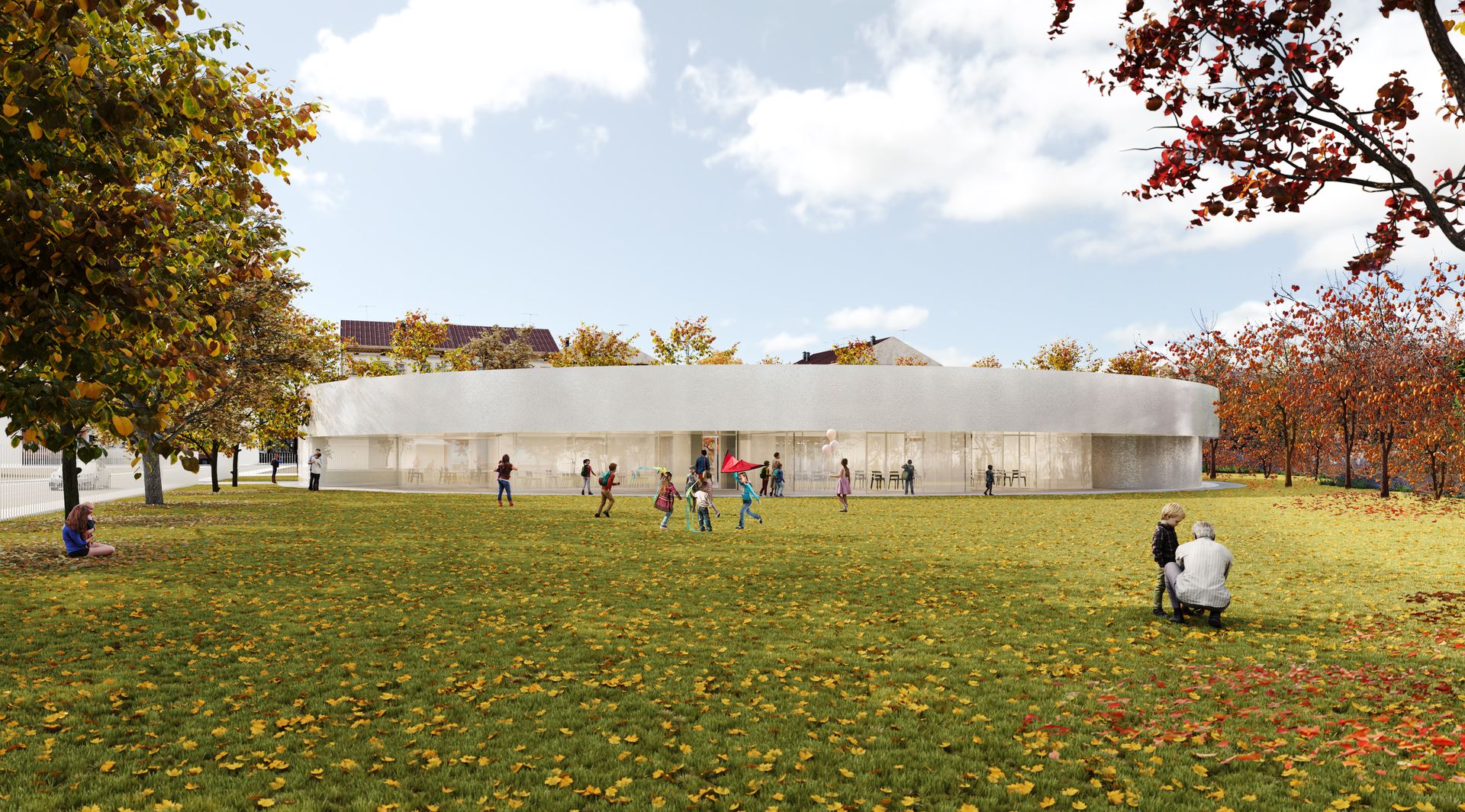 Collocata nella parte settentrionale di un lotto attualmente occupato da un parcheggio, che si affaccia su Via Padova, la nuova scuola, a pianta circolare, che è storicamente un elemento di centralità e coesione sociale in ogni cultura si sviluppa su un unico livello. Il progetto conserva gli alberi esistenti: i due filari di tigli, lungo via Padova e il confine settentrionale del lotto e i due grandi cedri dell’attuale giardino pubblico, aggiungendo nuovi tigli, betulle, cachi e siepi di lavanda.
