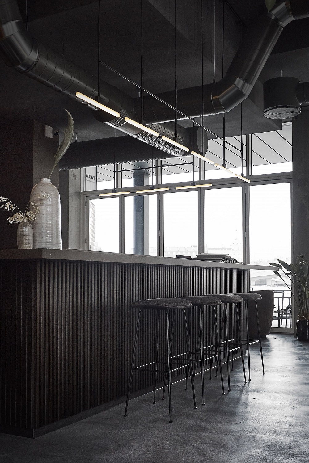 Per ottenere quest’atmosfera hygge, Norm Architects ha utilizzato una palette di materiali scuri e caldi in abbinamento a luci soffuse. Il progetto è stato condotto nel rispetto delle caratteristiche dello spazio preesistente e del paesaggio architettonico: la palette di colori scelti richiama le tonalità degli esterni dell’edificio ed intensifica l’intimità degli interni.