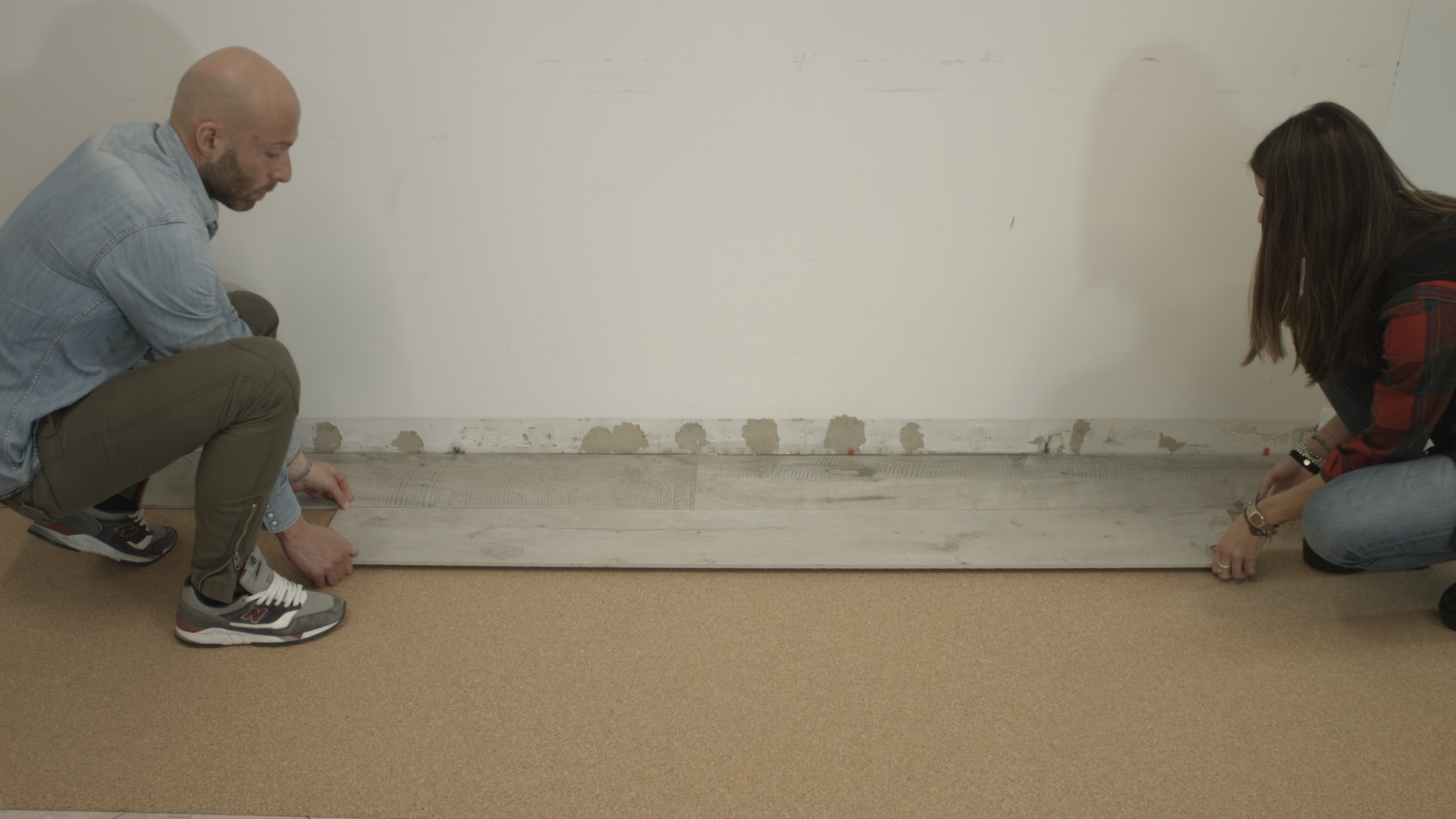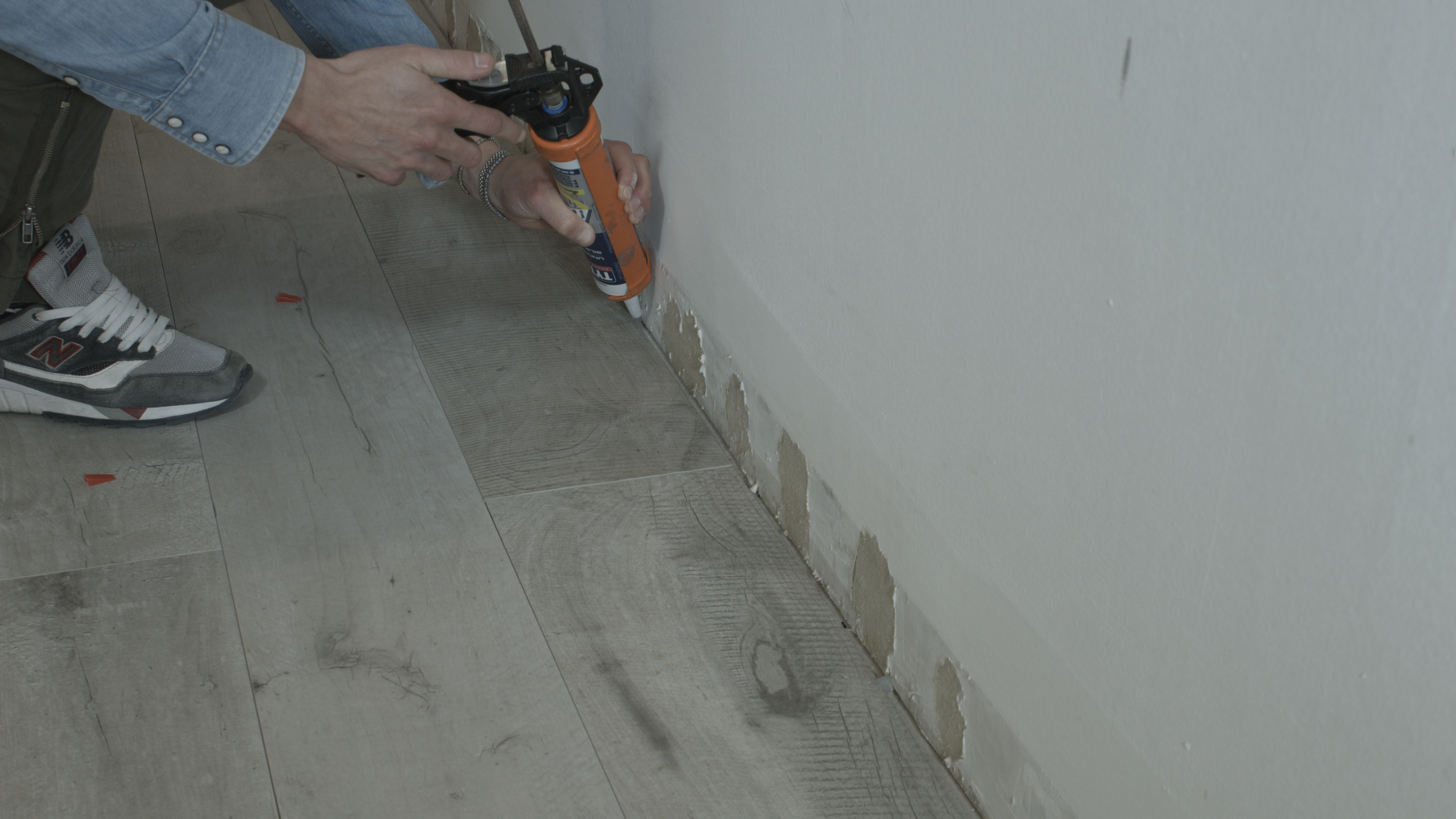 Per contenere le dilatazioni si consiglia di applicare qualche goccia di silicone lungo il perimetro, per poi rimuovere i distanziali e procedere con l’inserimento del profilo o del battiscopa. Il nuovo pavimento, la cui superficie risulterà perfettamente planare anche senza l’utilizzo di colle e sigillanti, potrà facilmente essere rimosso e recuperato in qualsiasi momento.