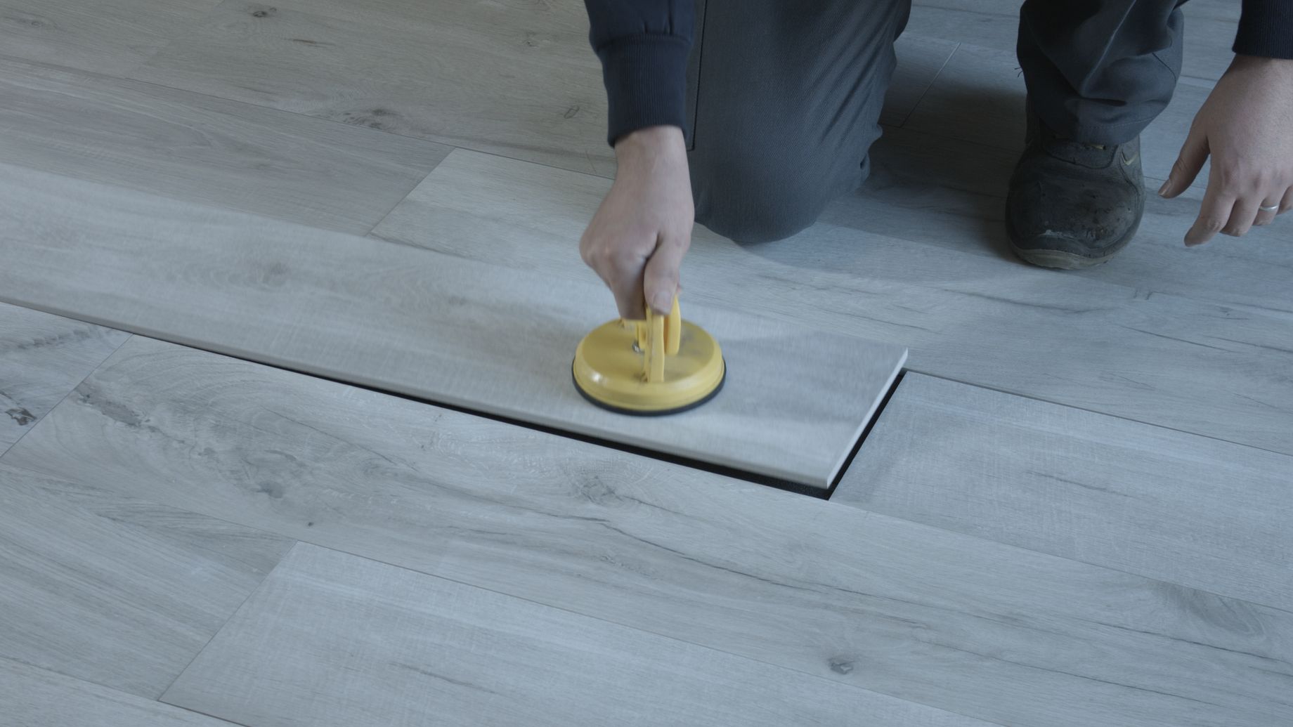 Dopo aver steso un tappetino in sughero o polietilene dello spessore di circa 2 mm, si consiglia di posizionare una serie di distanziali di 5 mm lungo tutte le pareti interessate per poi proseguire con la posa delle piastrelle, a giunto unito, praticando tutti i tagli necessari fino a coprire completamente il vecchio pavimento.
