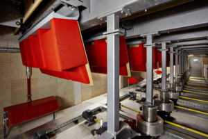 Il pavimento non è fisso, ma è montato su un sistema di gradoni mobili a pantografo che può avere una configurazione piana oppure inclinata; nella configurazione piana le sedie possono scomparire con un cinematismo al di sotto del pavimento, realizzando un’unica superficie adattata per attività espositive. L’altra caratteristica fondamentale riguarda l’acustica con la presenza di pannelli mobili, incernierati sulla verticale, che possono modificare, attraverso la loro composizione e finitura differente su ciascuna delle due ogni facce, i tempi di riverberazione in funzione delle necessità acustiche della sala.