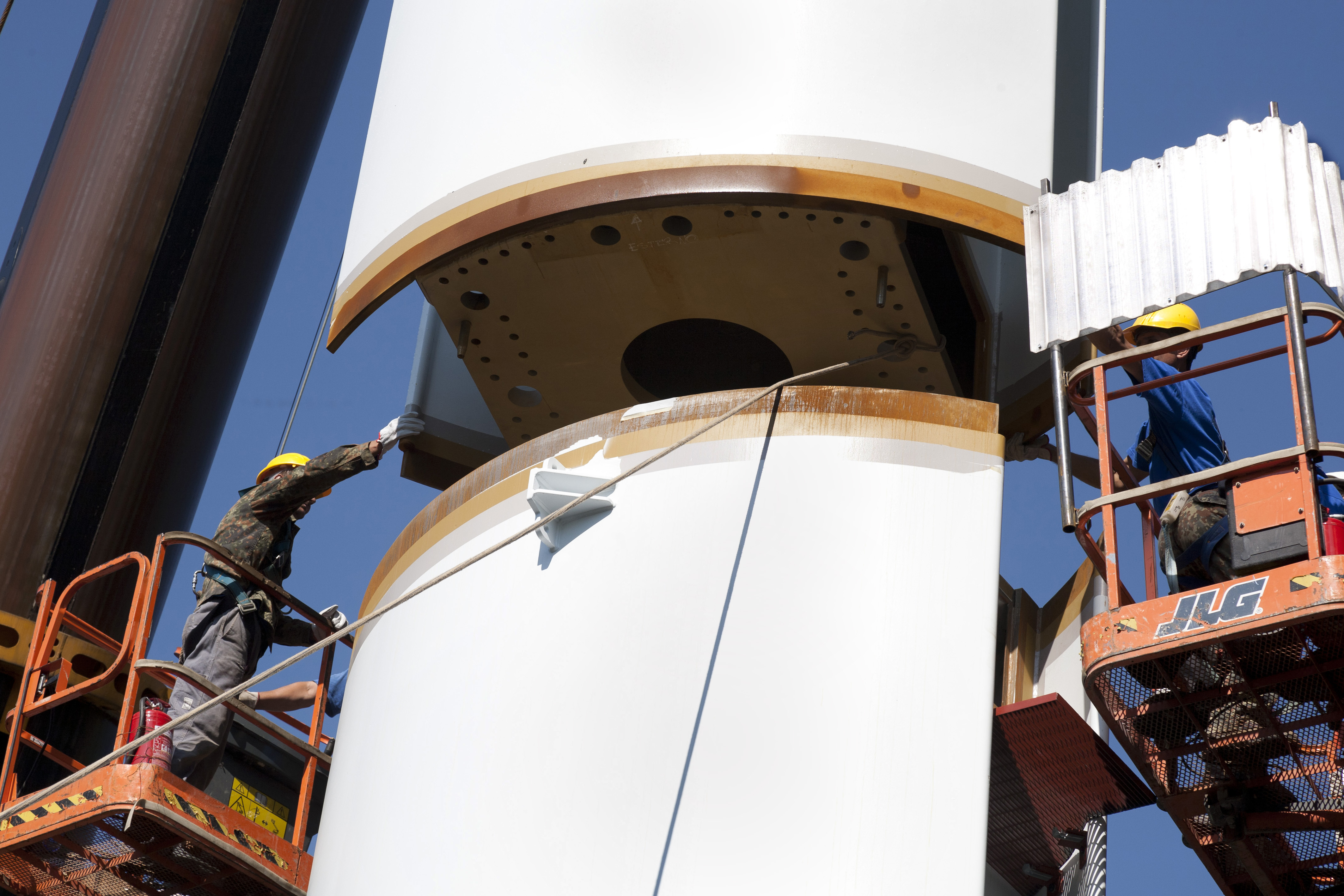 Ognuna delle mega colonne, aventi un interasse di 16,5 m, è composta da due gusci esterni realizzati con lastre da 30 mm curvate con un raggio di 1.956 mm per un’impronta complessiva alla base di 2.805×1.968 mm, distanziate tra di loro da piatti paralleli anch’essi realizzati con lastre da 30 mm.