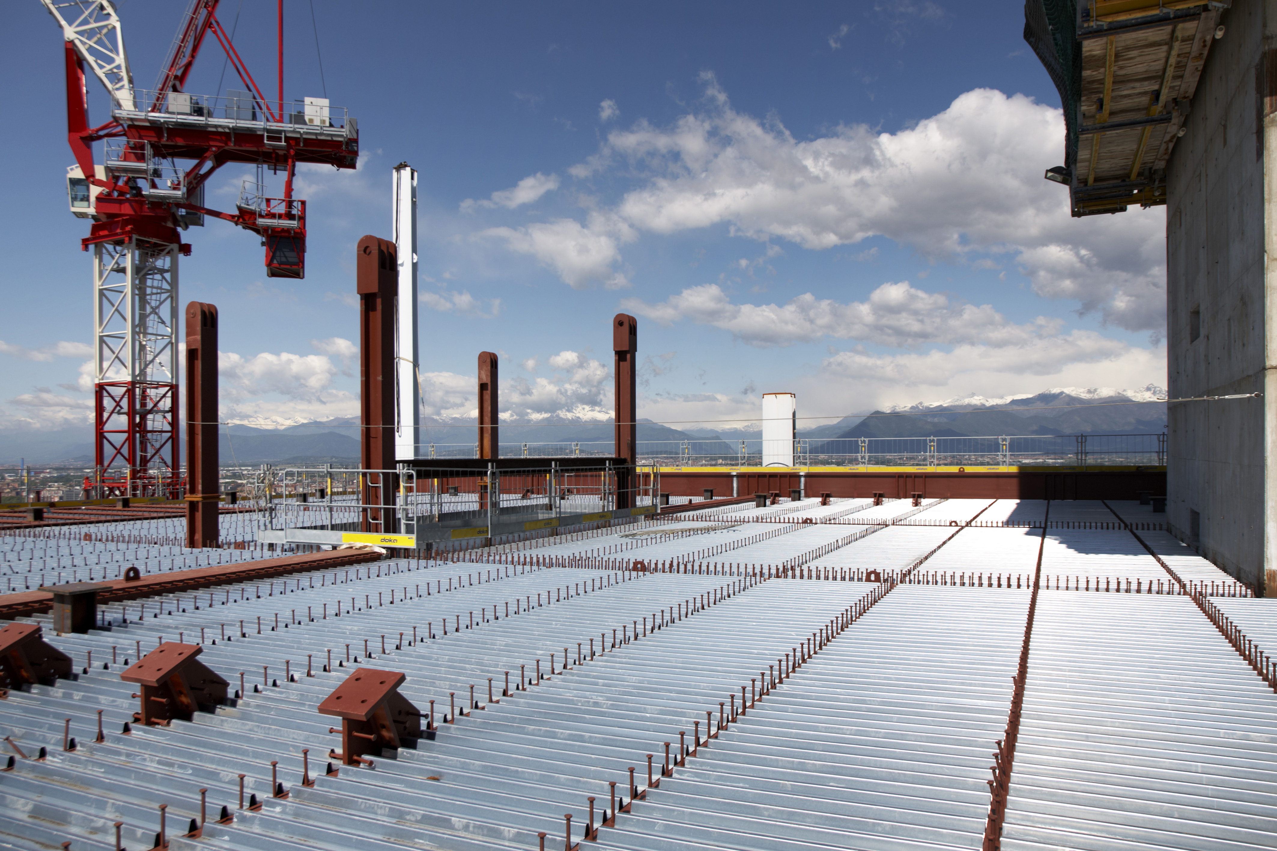 I solai dei piani tipo per gli uffici sono stati realizzati da Isocell Italia, con produzione continua all’interno delle 24 ore giornaliere, attraverso tegoli prefabbricati; in 11 mesi sono stati prodotti e cantierizzati 1.400 tegoli con relative 8mila coppelle di chiusura e le quasi 80 travi impiegando 5.600 mc di calcestruzzo per la realizzazione della parte prefabbricata di solai.