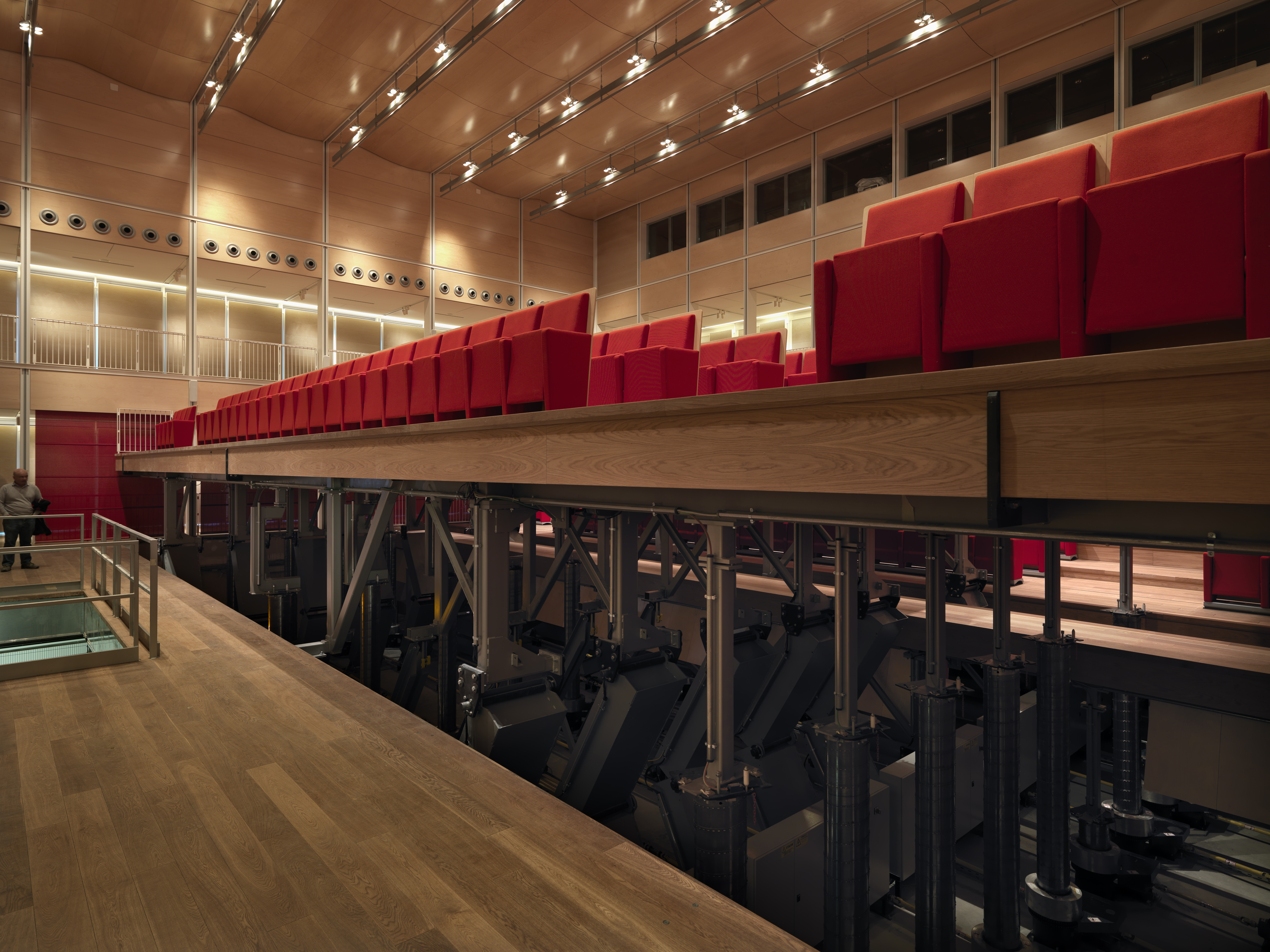 Il pavimento non è fisso, ma è montato su un sistema di gradoni mobili a pantografo che può avere una configurazione piana oppure inclinata; nella configurazione piana le sedie possono scomparire con un cinematismo al di sotto del pavimento, realizzando un’unica superficie adattata per attività espositive. L’altra caratteristica fondamentale riguarda l’acustica con la presenza di pannelli mobili, incernierati sulla verticale, che possono modificare, attraverso la loro composizione e finitura differente su ciascuna delle due ogni facce, i tempi di riverberazione in funzione delle necessità acustiche della sala.