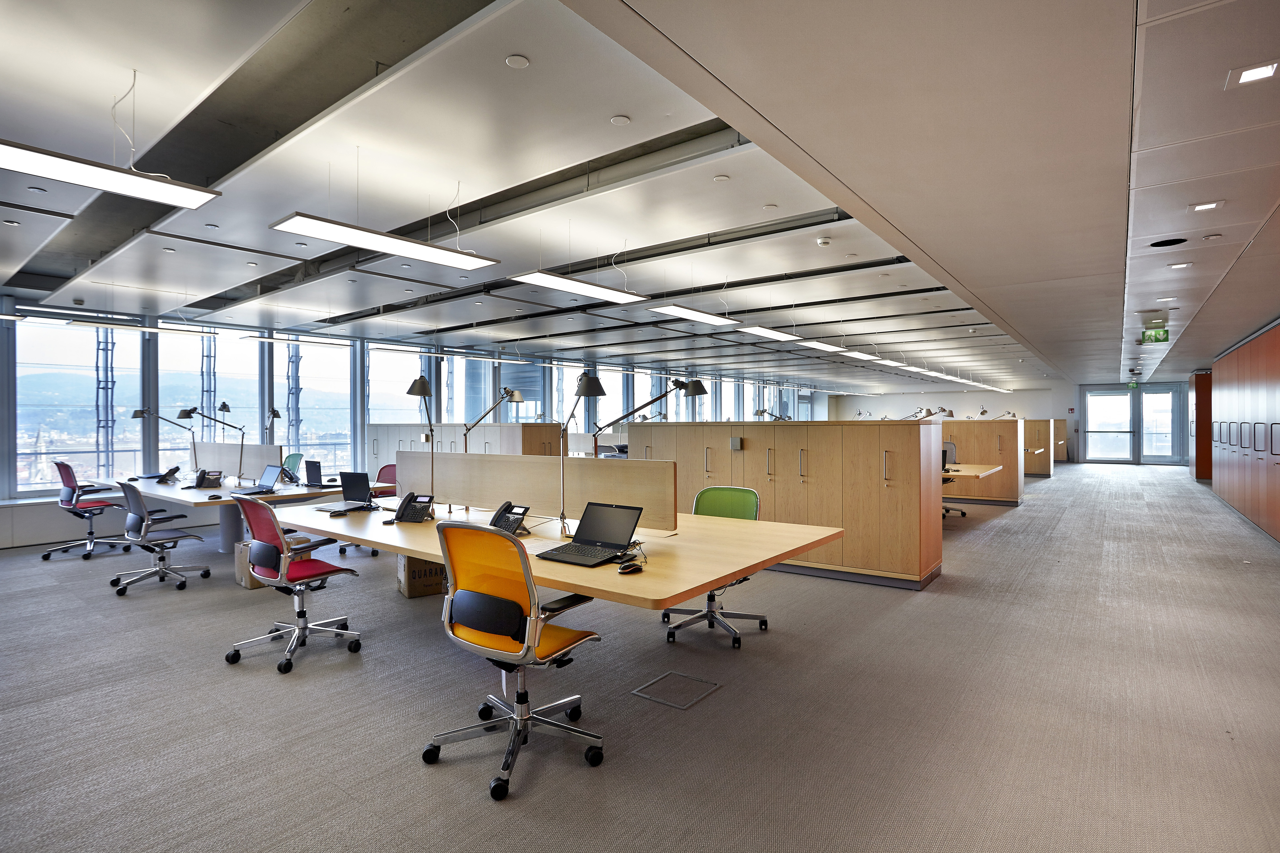 Complessivamente gli uffici ospitano oltre 2mila persone a cui si aggiunge la capienza dell’auditorium da 364 posti. Agli ultimi piani, nella serra bioclimatica, sono previsti un ristorante, uno spazio espositivo e una caffetteria con terrazza panoramica. Nei piani interrati trovano collocazione le aree a servizio dei dipendenti e degli impianti. Sul giardino ipogeo del primo interrato si affacciano la mensa aziendale, l’asilo nido e una piccola area fitness. Ai livelli inferiori si sviluppano spazi a parcheggio per oltre 300 vetture e i principali locali tecnici. L’impianto di climatizzazione sfrutta l’energia di tipo geotermico con prelievo e restituzione di acqua di falda senza emissioni nocive in atmosfera.