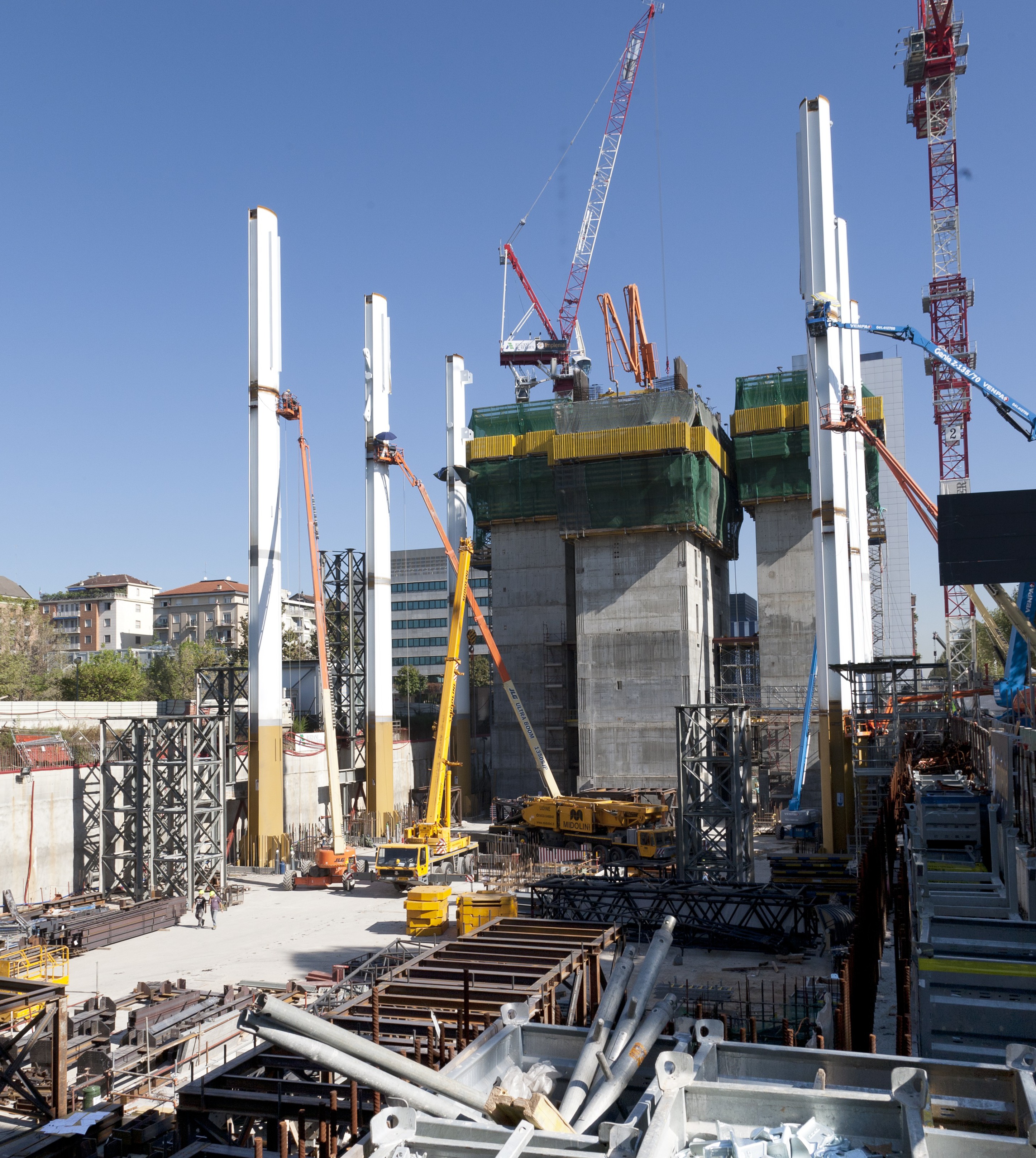 Il sistema strutturale portante è costituito da sei mega colonne, realizzate da Cimolai, tre per ogni lato (est e ovest) del fabbricato, in struttura mista acciaio calcestruzzo al cui interno si sviluppano (con differente passo) 5 controventature per ogni lato in grado di irrigidire i tre elementi e conseguentemente l’intero fabbricato. Le mega colonne si innestano al livello B2 e scaricano direttamente al piano fondazionale tutto il carico dell’edificio.