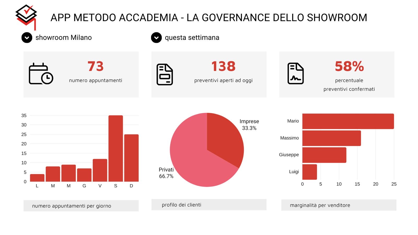 L’idea alla base di App Metodo Accademia nasce dalla necessità di gestire in modo più efficace un ambito spesso trascurato e poco controllato: gli showroom. Questi, a causa della mancanza di un metodo condiviso, della riluttanza dei venditori nell’utilizzare CRM poco intuitivi e delle difficoltà nell’elaborare preventivi con i sistemi attuali (, finiscono per contribuire alle perdite di vendite, rappresentando una voce “invisibile” nel bilancio aziendale.