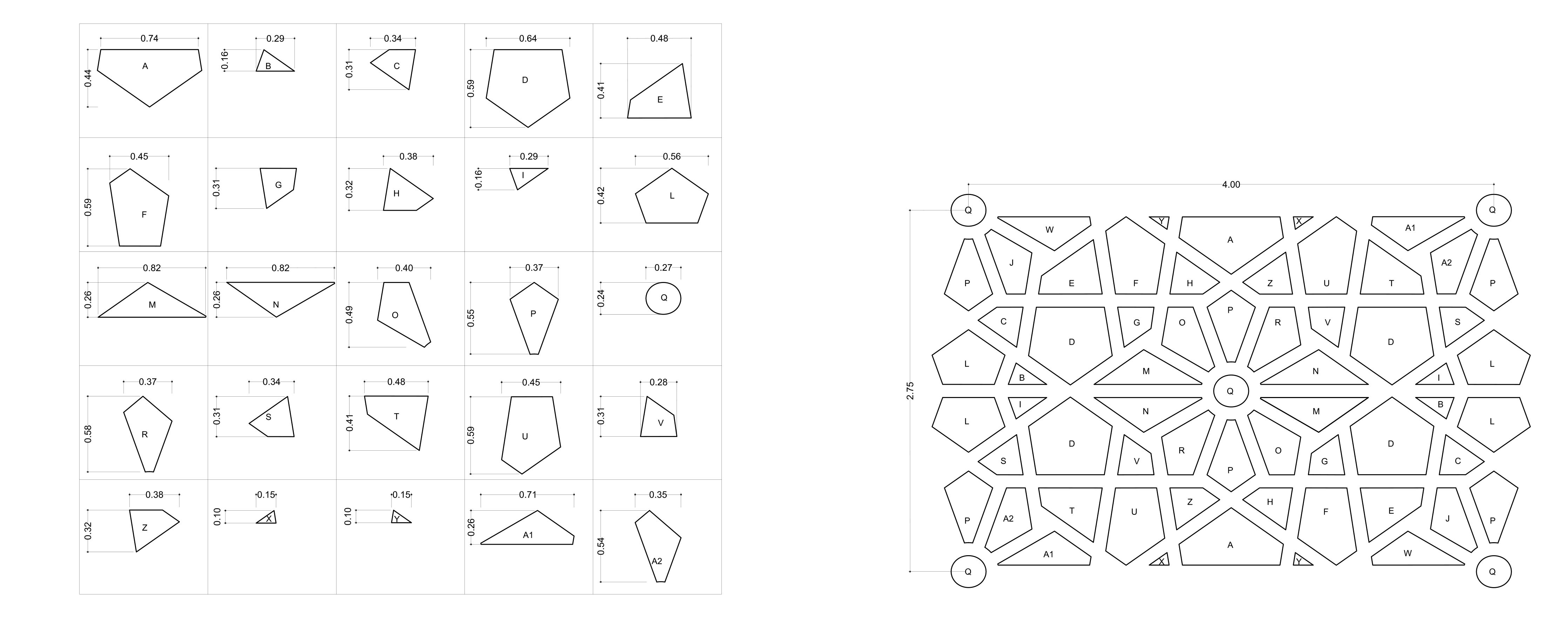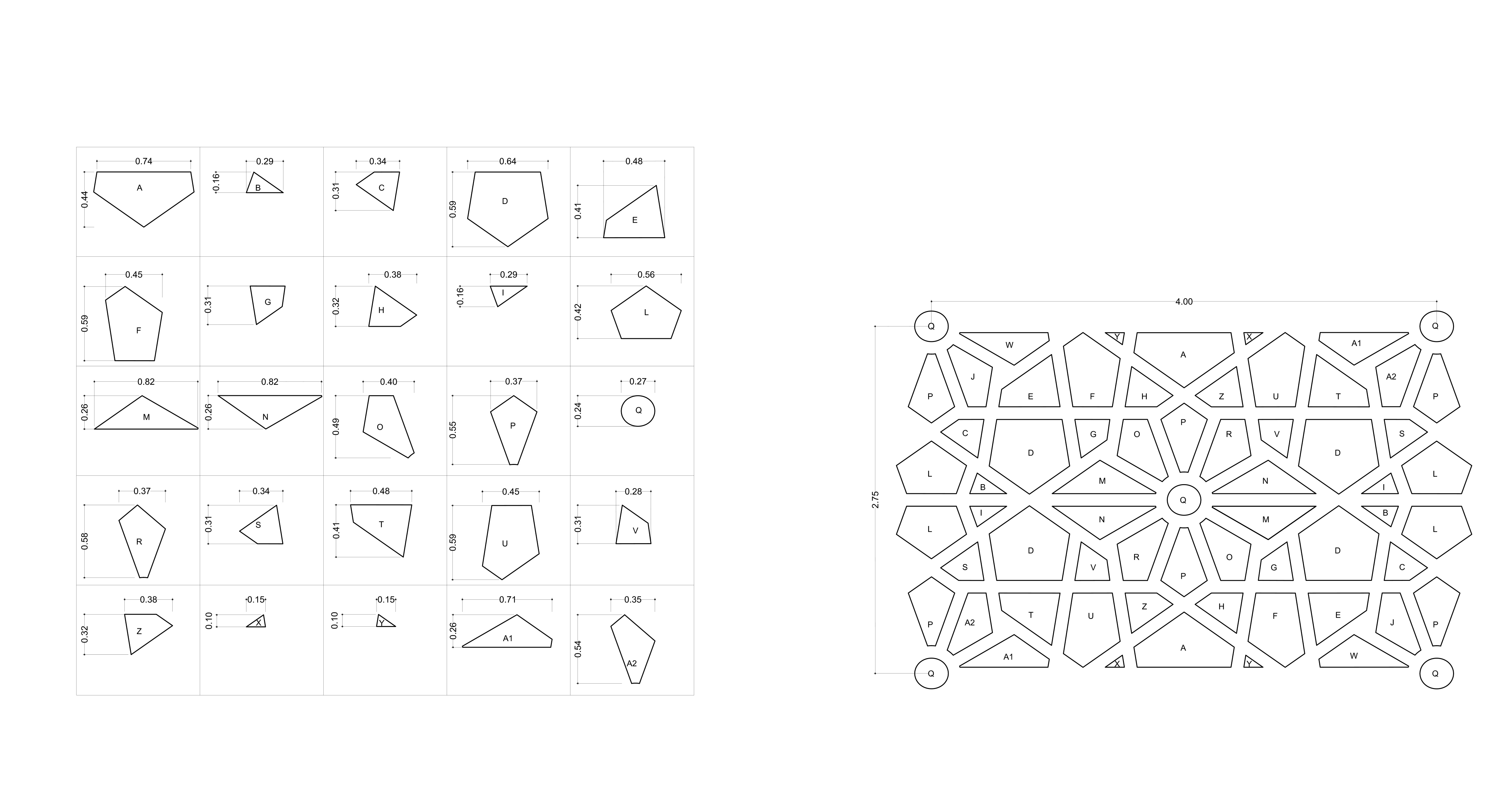 Lo schema base che costituisce il modulo del disegno ha una dimensione complessiva di 2,75 x 4 m e viene ripetuto a formare una composizione in cui i tracciati regolatori compongono una regola romboidale.