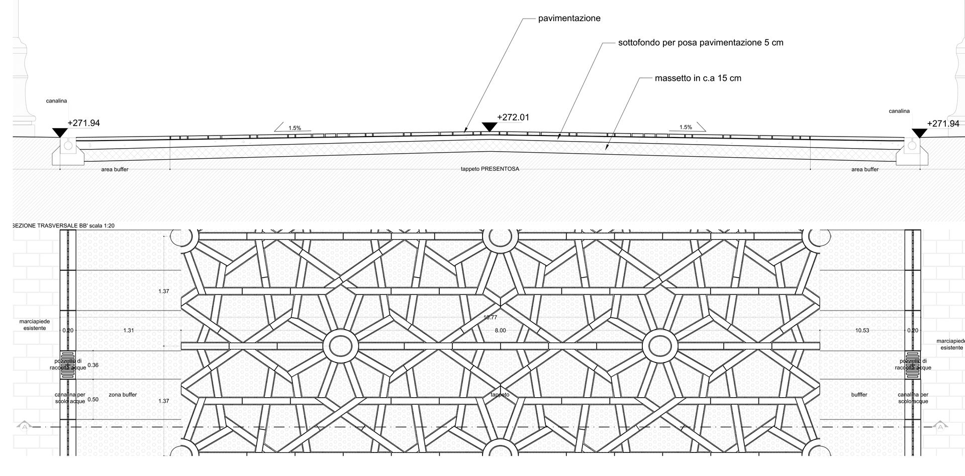 Un grande tappeto, formalmente concluso, connotato da una precisa geometria, si estende nella sua tessitura di sfondo sull’intera sezione trasversale del tracciato, riammagliandosi dove possibile alla pavimentazione esistente.