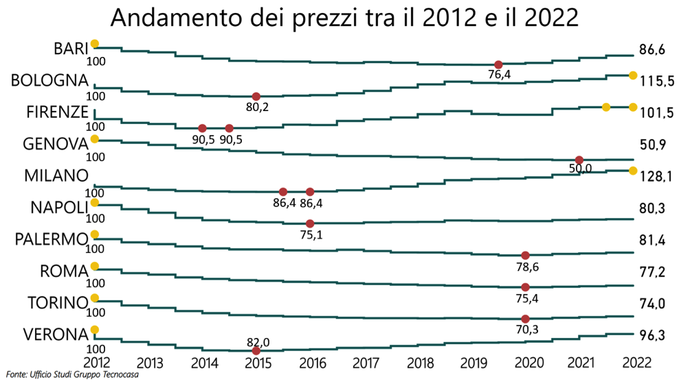 Tecnocasa ha analizzato e messo a confronto l’andamento dei prezzi delle abitazioni nelle grandi città italiane tra il 2012 e il 2022.