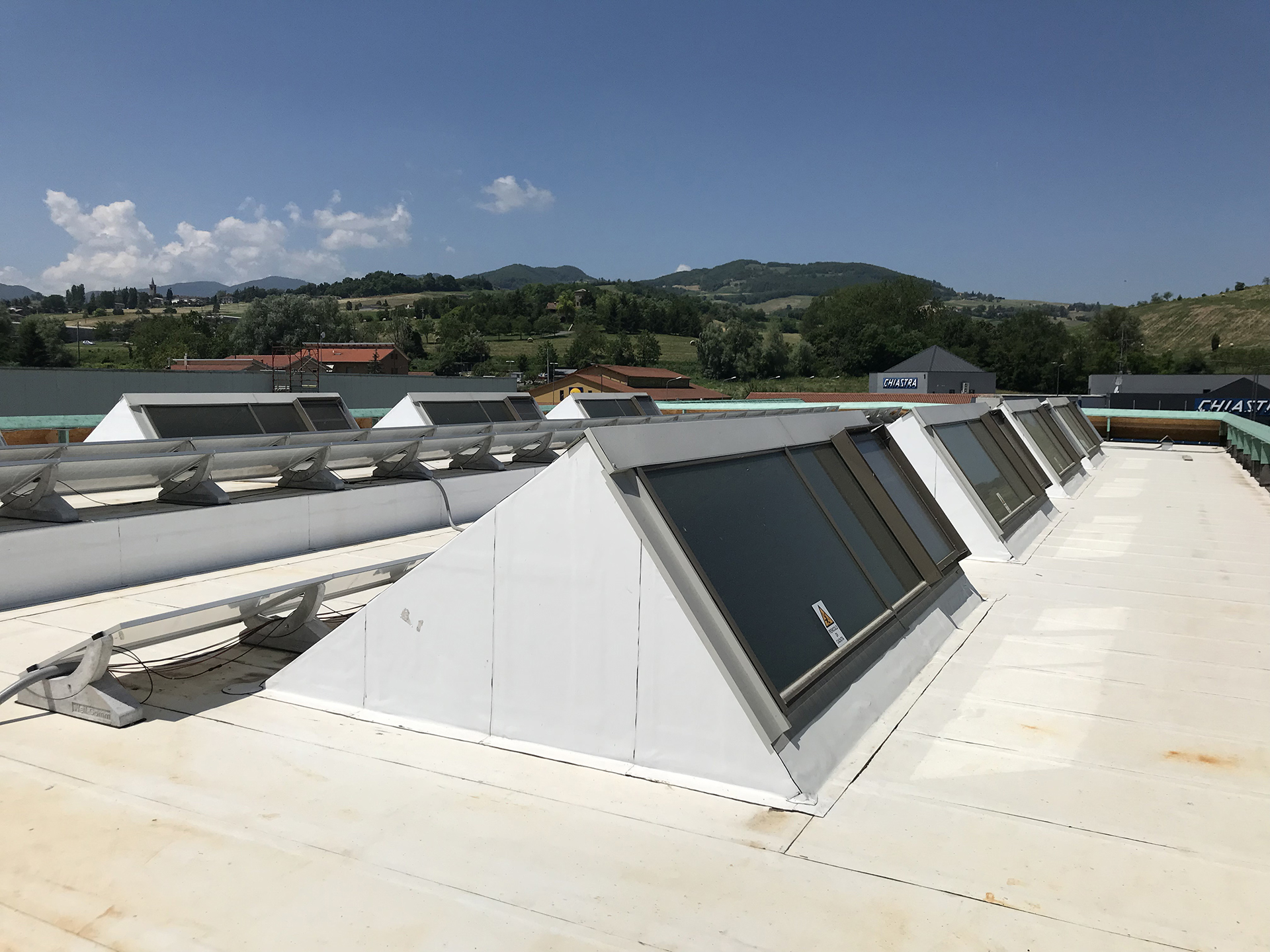 Due file di ampi lucernari diffondono dall’alto la luce naturale su tutto lo spazio di vendita, mentre dall’interno è possibile una piacevole visione dell’esterno attraverso le ampie vetrate che caratterizzano la facciata d’ingresso.