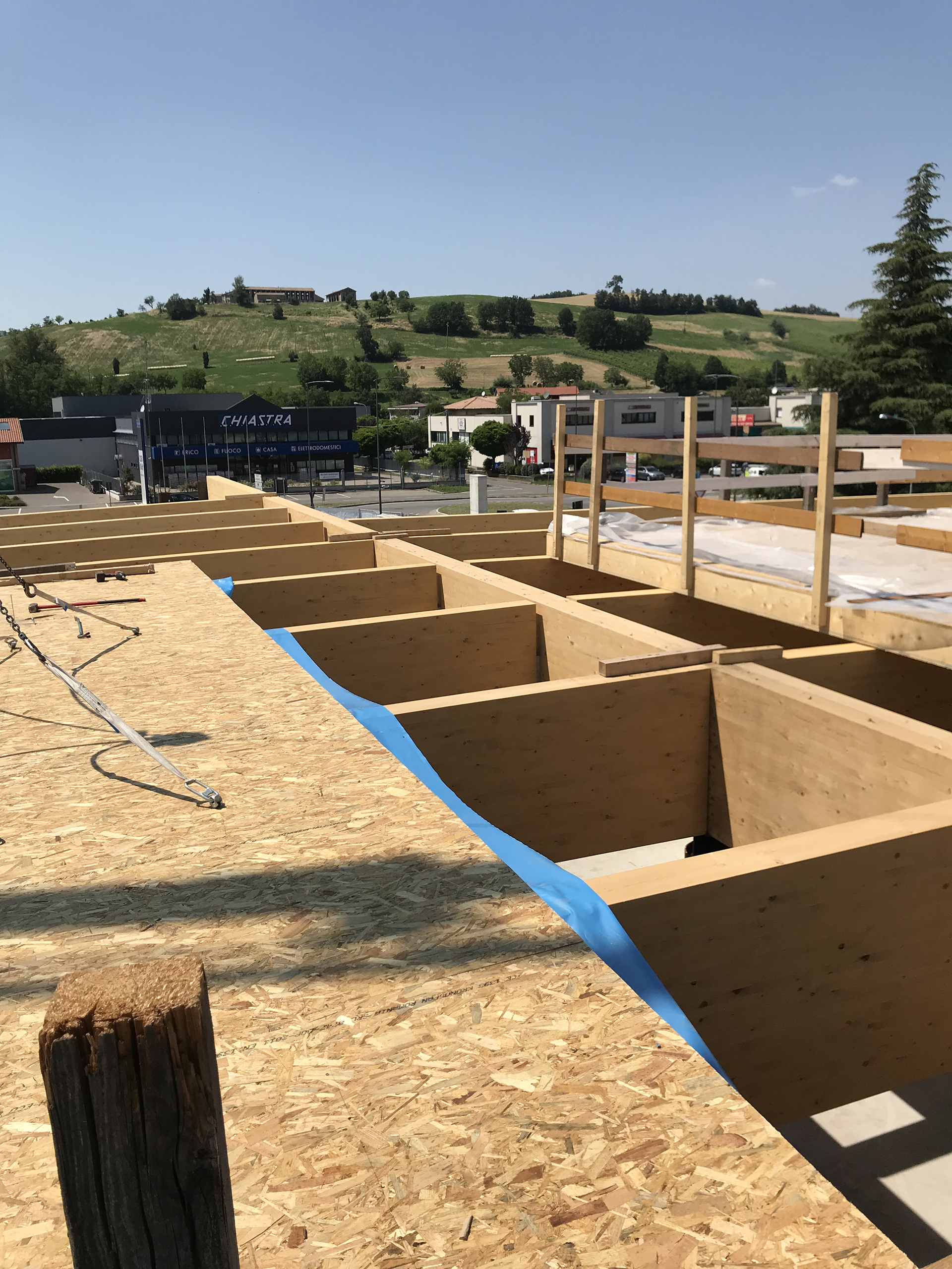 Il solaio di copertura è stato realizzato con una struttura scatolare composta da un doppio strato di pannelli in scaglie di legno a strati incollati e pressati (Osb) con interposta una serie di travetti in legno lamellare e isolamento in lana minerale.