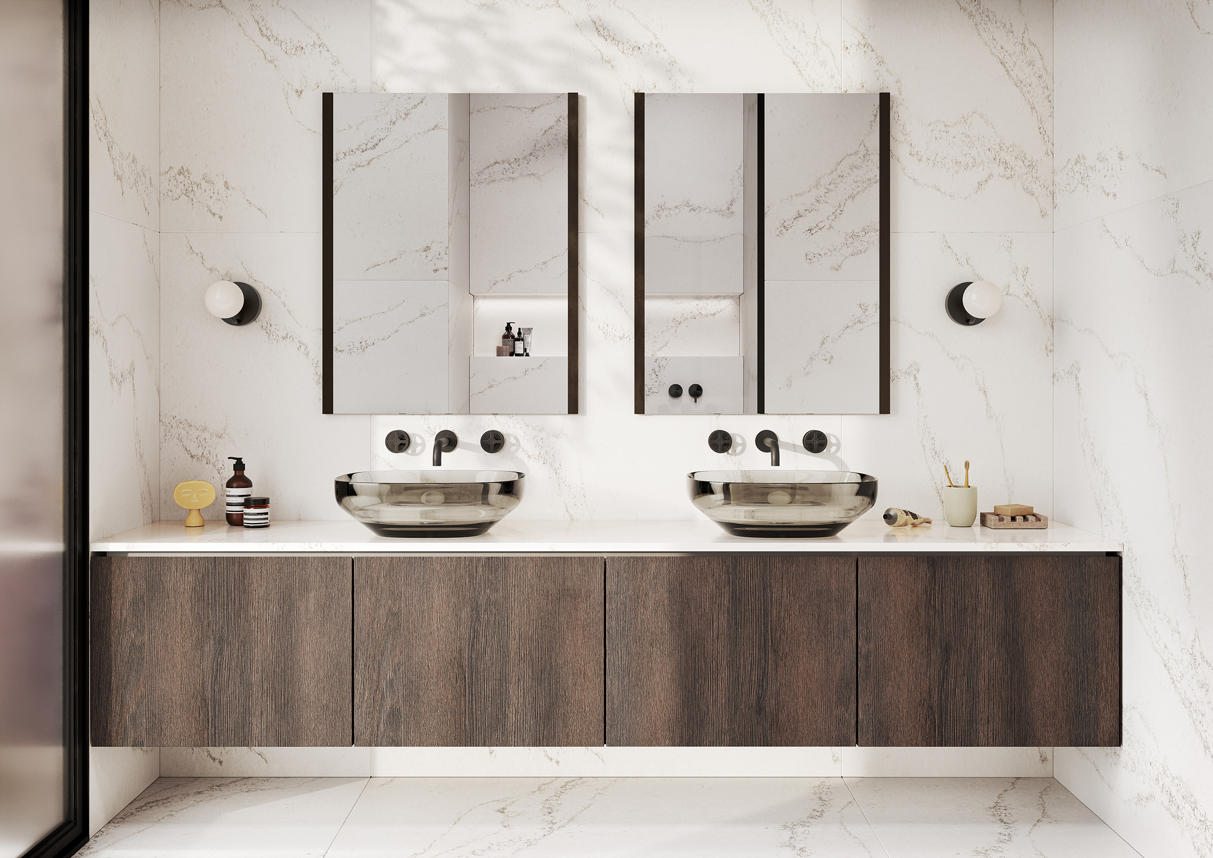 Con una formula naturale, priva di silice cristallina, è proposto in lastre di grandi dimensioni “a tutta massa”, ovvero con colori minerali presenti nell’impasto, non stampati, che emergono con coerenza in caso di lavorazioni quali tagli, incisioni e fori.