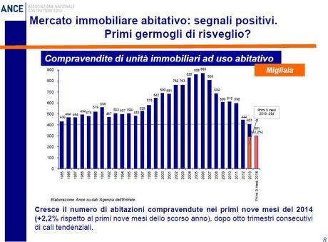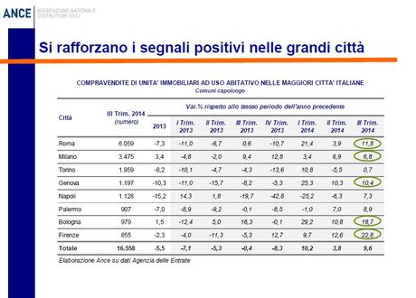 «A fronte di questa difficile situazione sono percepibili alcuni riscontri positivi legati al settore della riqualificazione del patrimonio abitativo che invece è cresciuto del 20 per cento grazie, probabilmente, agli incentivi riguardanti il risparmio energetico e le ristrutturazioni edilizie. Inoltre, nei primi mesi del 2014 si registra un segnale positivo che potrebbe far sperare che il numero delle compravendite sia cresciuto del 2,2 per cento grazie anche a una maggiore disponibilità da parte delle banche a rilasciare finanziamenti e a una riduzione del prezzo delle case. E questi segnali positivi si rilevano principalmente nelle otto grandi città italiane, aspetto che fa sperare che le città anticiperanno la ripresa, in particolare anche per quanto riguarda i lavori pubblici».