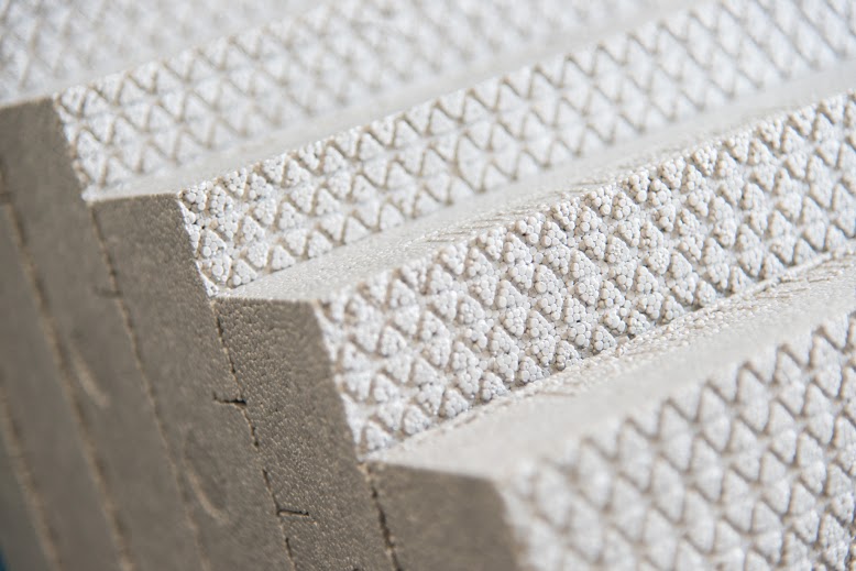 «La faccia interna di Greypor GK 800 presenta una texture a rilievo, distribuita sulla cornice perimetrale e sulle 6 aree rettangolari al centro della lastra: evidenziano i punti ad aderenza migliorata più adatti alla stesura della colla, garantendone la posa di almeno il 40%. La faccia esterna è stampata con una goffratura geometrica che assicura un perfetto aggrappo del rasante. I tagli rompi tratta riducono le tensioni superficiali, per una migliore stabilità. Mentre le dimensioni delle lastre (1.200 x 600 cm) maggiori di quelle standard permettono di diminuire i tempi di posa. Con una minor incidenza in caso di fissaggio meccanico a parità di numero di tasselli per lastra». Leonardo Vetturi, responsabile supporto tecnico e sviluppo Lape