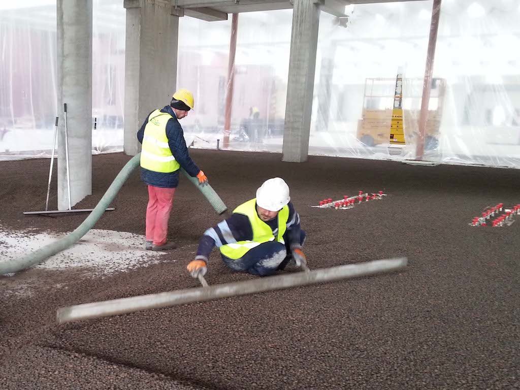 Nel cantiere della nuova sede Twinset l’utilizzo di Leca Termopiù ha consentito di realizzare un sottofondo isolante e con adeguate caratteristiche di portanza. In questo caso Leca Termopiù è stata utilizzata nella versione sfusa imboiaccata, modalità che massimizza le prestazioni termiche e la velocità esecutiva, e posata con pompe, assicurando così una elevata velocità costruttiva fondamentale nello svolgimento delle attività di cantiere. Complessivamente sono stati posati circa 330 mc di prodotto su una superficie di oltre 600 mq.