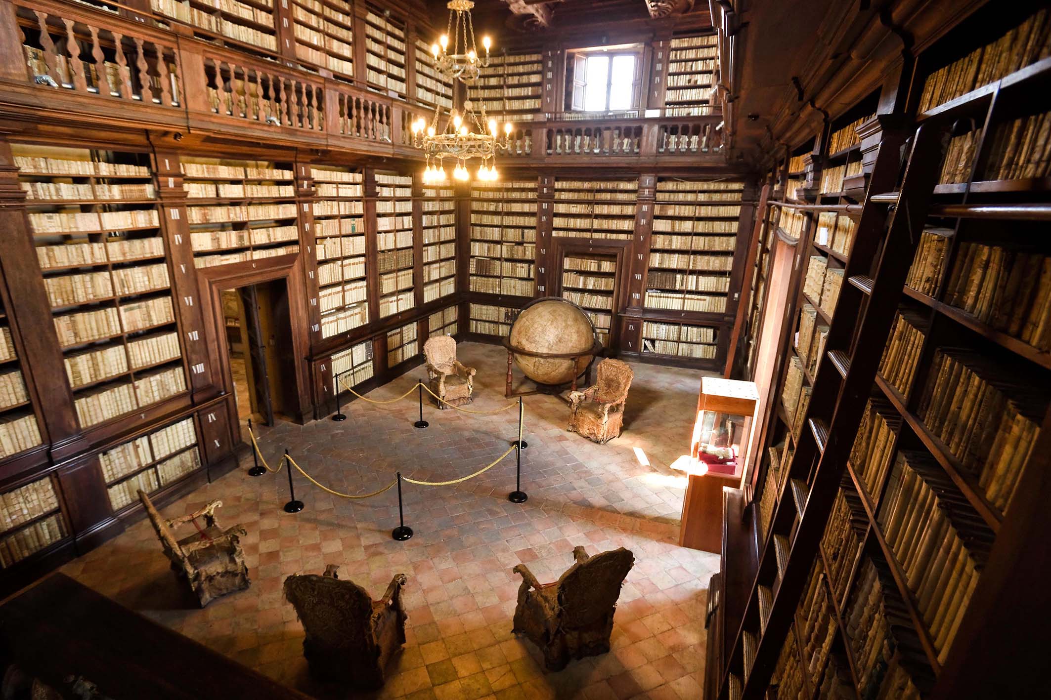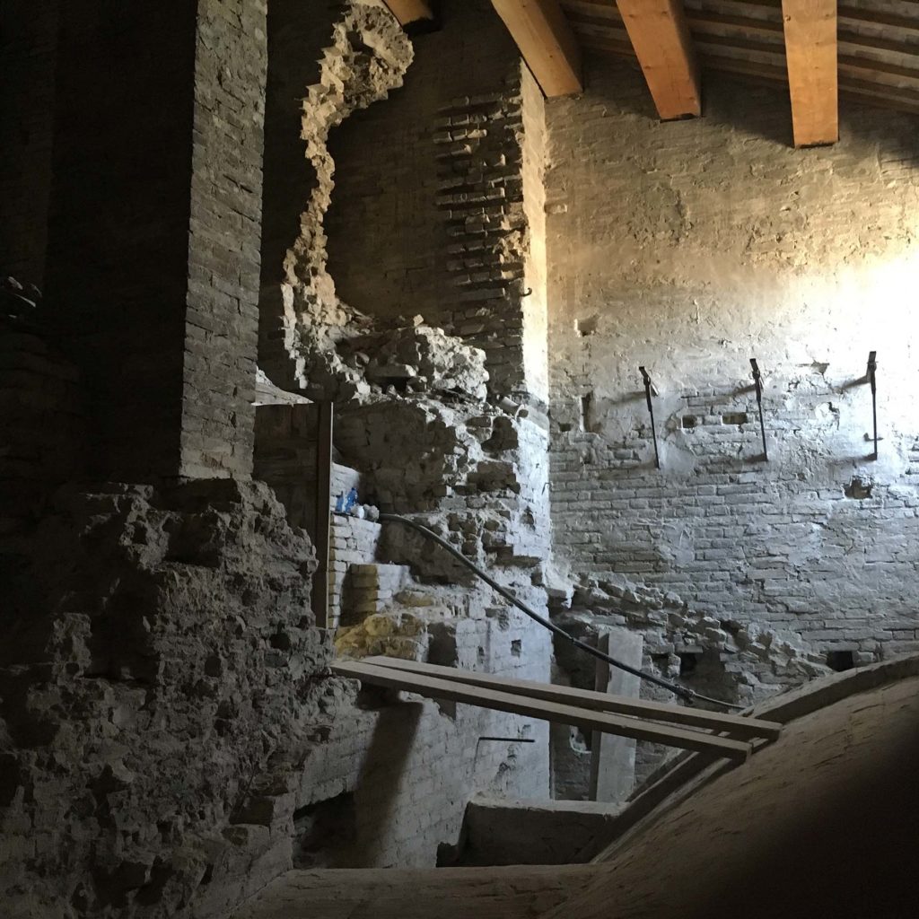 Le sezioni dell’edificio maggiormente danneggiate dal sisma sono state la sezione picena del Museo Archeologico al primo piano e, al secondo piano, la Pinacoteca Civica, con la prestigiosa Sala del Mappamondo.