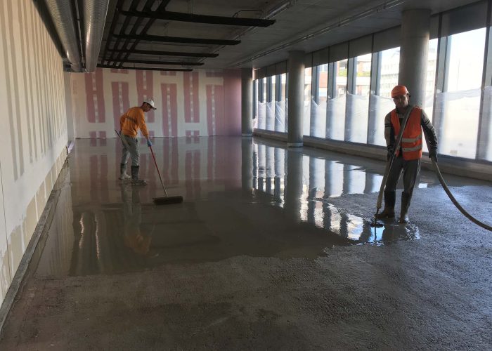 Nella realizzazione dei pavimenti delle nuove superfici, che necessariamente dovevano essere sopraelevati per consentire il cablaggio e il passaggio dei cavi e consentire l’installazione della sottostruttura di sostegno dei pannelli galleggianti, era necessario un piano d’appoggio ben livellato. L’esigenza quindi era quella di portare entro i requisiti di tolleranza richiesti dal produttore del sistema di pavimenti sopraelevati le superfici dei solai molto disomogenee allo stato di fatto. Tale obiettivo è stato raggiunto attraverso l’uso di PaRis Slim di Laterlite, il massetto autolivellante antiritiro a basso spessore ideale per sistemi di riscaldamento a pavimento e lisciature di fondi irregolari.