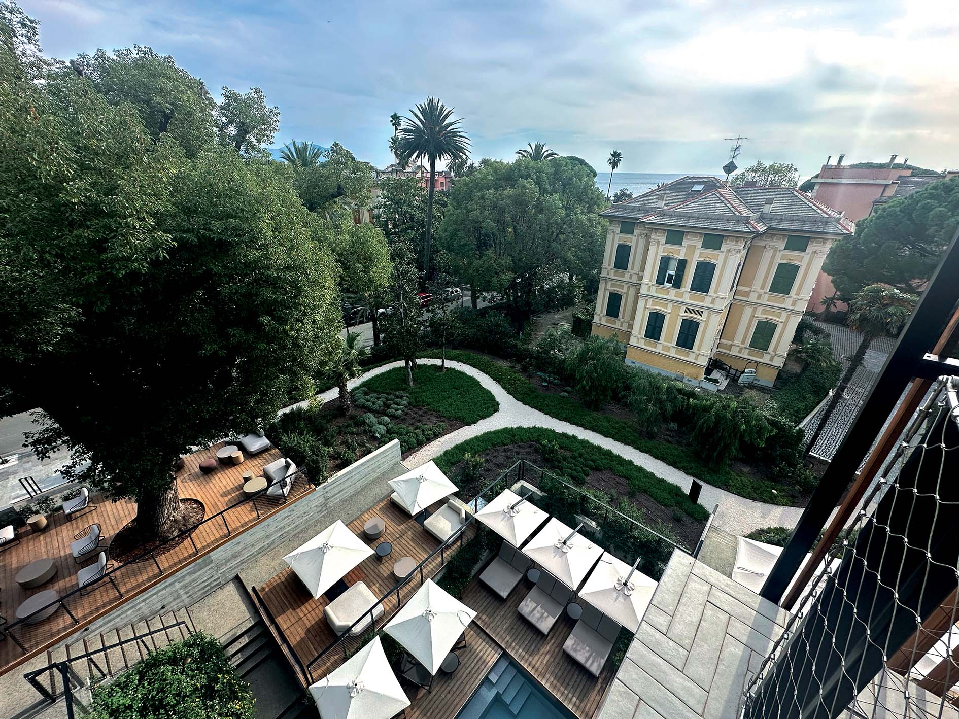 L’Architetto Aldo Parisotto ha voluto creare un “parco con hotel”, valorizzando la vegetazione ligure preesistente e ricostruendo un tipico giardino ligure. Gli alberi storici, come magnolie, palme e canfore, sono stati preservati, mentre piante basse e un orto aromatico arricchiscono il contesto.