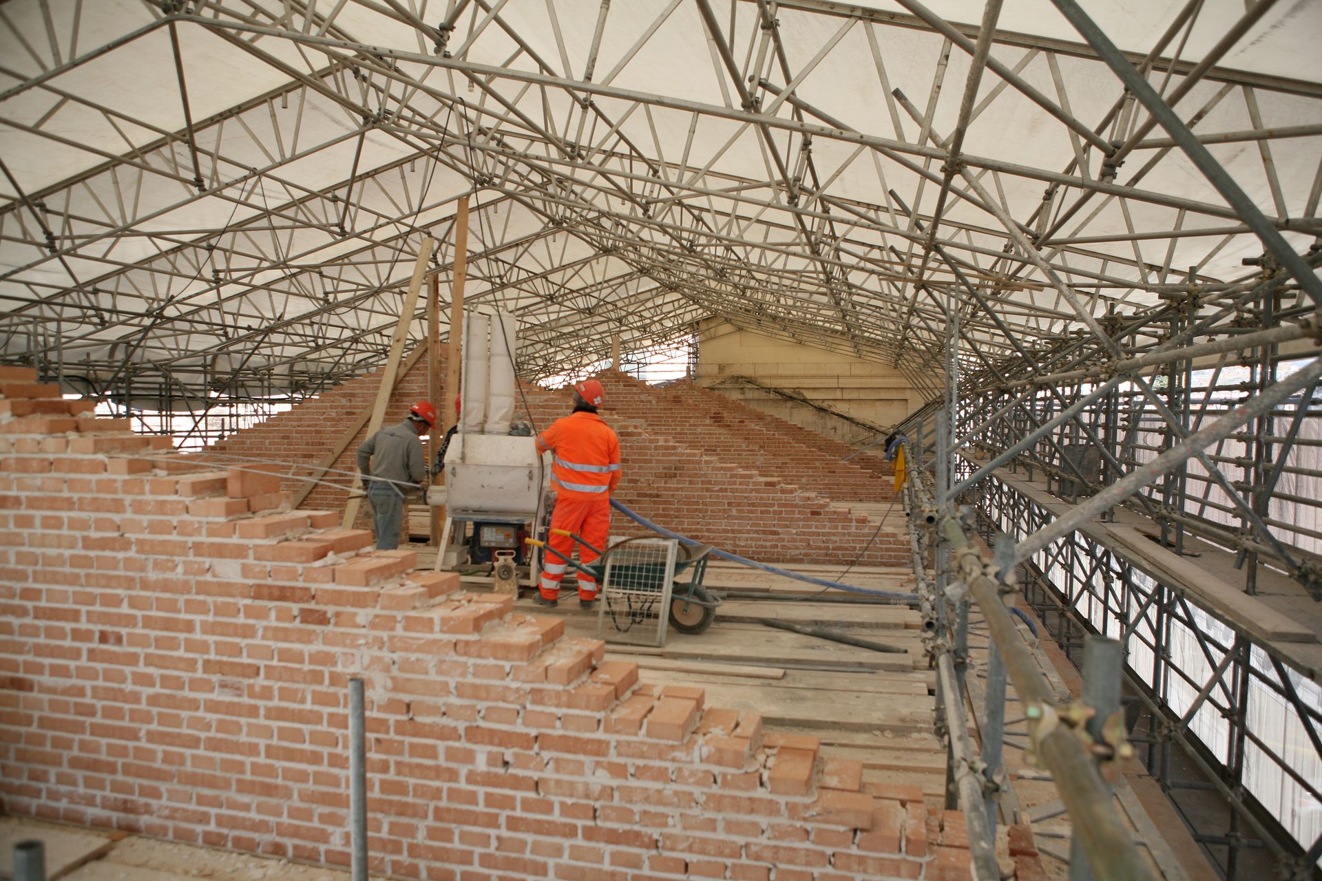 «Si tratta di alcuni corpi di fabbrica, articolati su altezze diverse. Un cantiere molto complesso, nel cuore del centro storico, a causa del sisma ci sono stati anche alcuni crolli e danni alle strutture di varia natura, soprattutto nella parte dell’Episcopio che ha una struttura totalmente in muratura e ha riportato lesioni importanti. Anche i solai e gli orizzontamenti voltati in alcuni casi sono risultati lesionati, anche nella parte alta degli edifici crollati. È stato importante per questo studiare la metodologia di intervento, anche perché i presìdi di messa in sicurezza messi in opera nel 2011 erano imponenti e hanno comportato una strategia di approccio al lavoro che è quella di consolidare le murature dal basso verso l’alto, mentre per gli orizzontamenti dall’alto verso il basso».