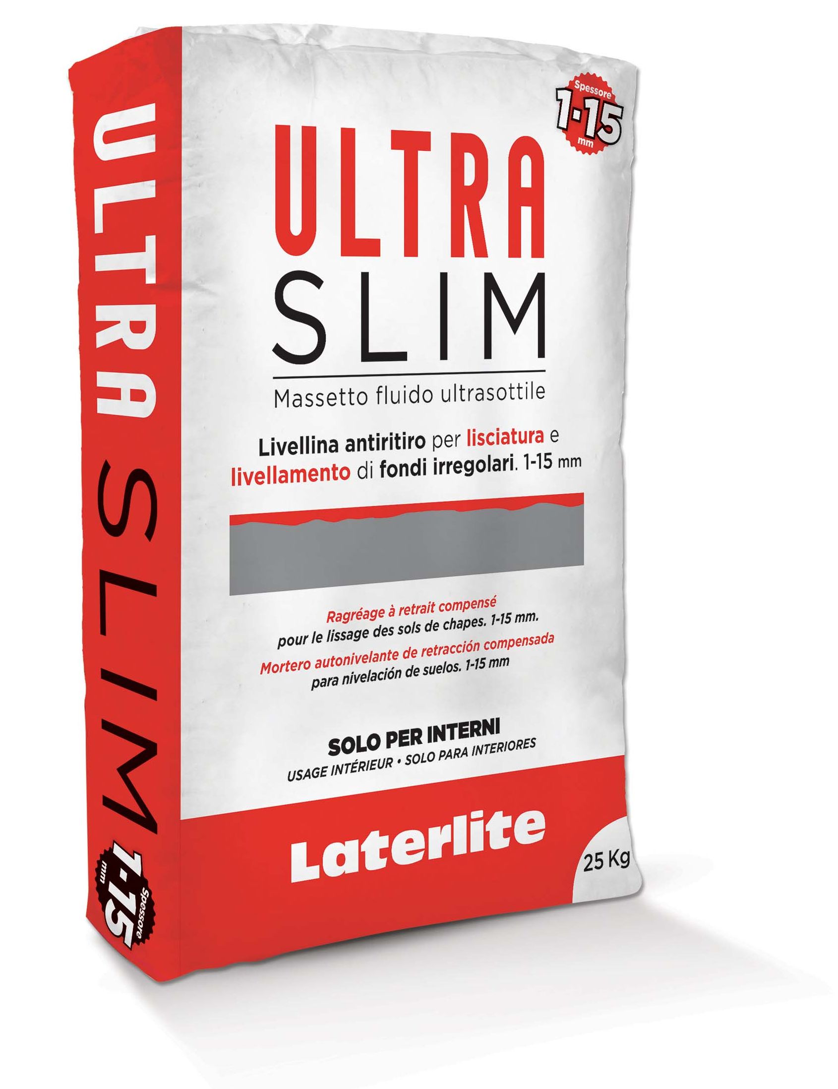 Spessore ultrasottile di 1-15 mm, consistenza autolivellante, antiritiro e tempi rapidi di posa sono le caratteristiche del nuovo Ultraslim, che racchiude tutto il know-how Laterlite nel segmento dei massetti premiscelati per la realizzazione di pavimenti da interni.