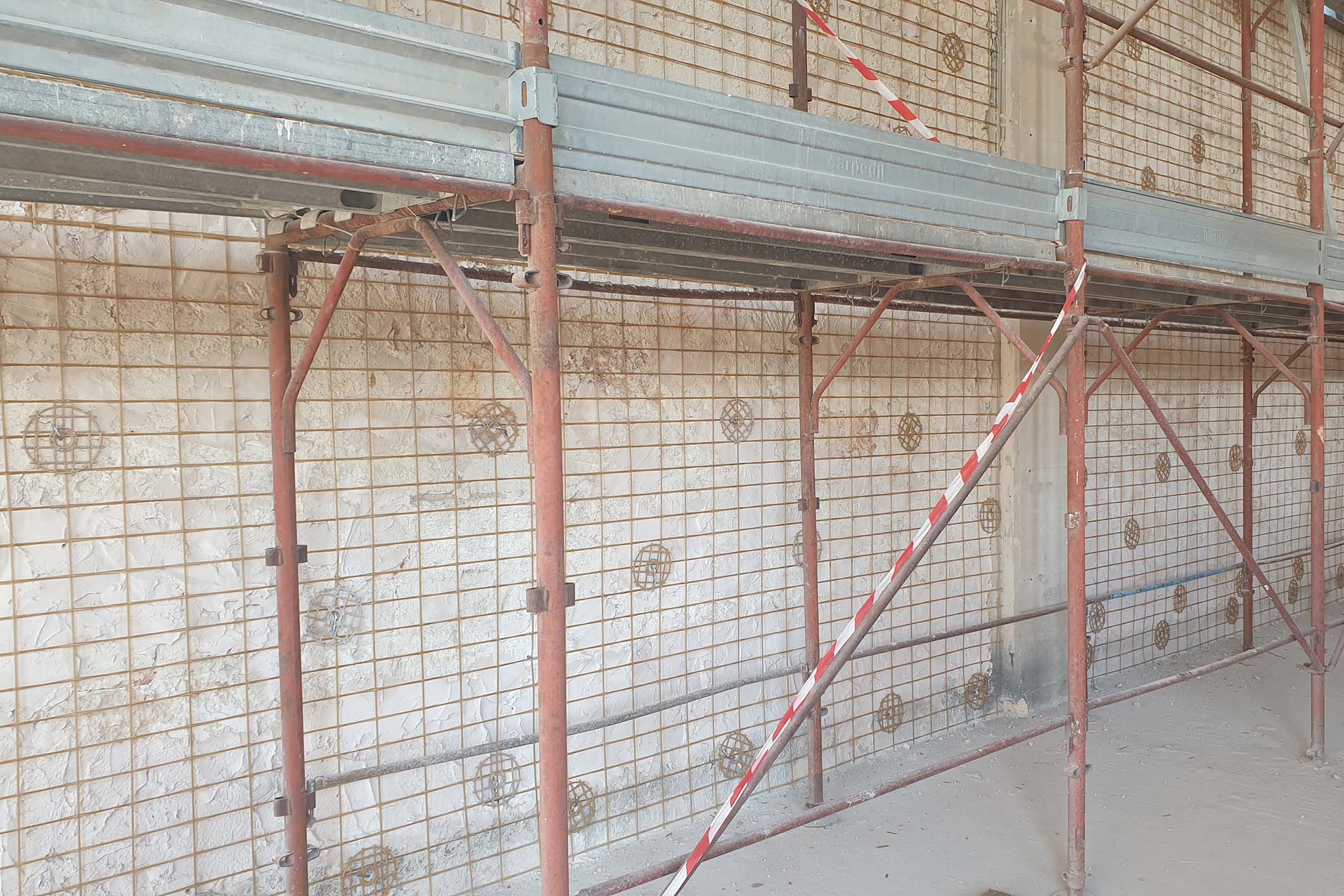Per il ripristino della muratura interna lato mare, è stato utilizzato il sistema CRM con la rete G-Mesh 400 in materiale composito GFRP, coprendo 1.400 m². Questa rete, insieme alla malta strutturale MX-CP Calce e ai connettori elicoidali, ha offerto un’alternativa efficace alle reti metalliche tradizionali, garantendo durabilità e resistenza meccanica.