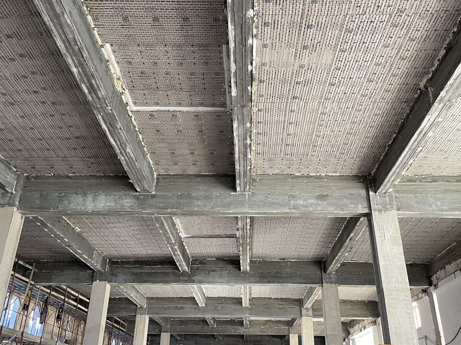 Il presidio antisfondellamento è stato realizzato con il sistema Stucanet, un pannello in rete metallica e cartone, rivestito con la malta fibrorinforzata Plasterwall, coprendo 2.670 m² di intradosso del solaio.