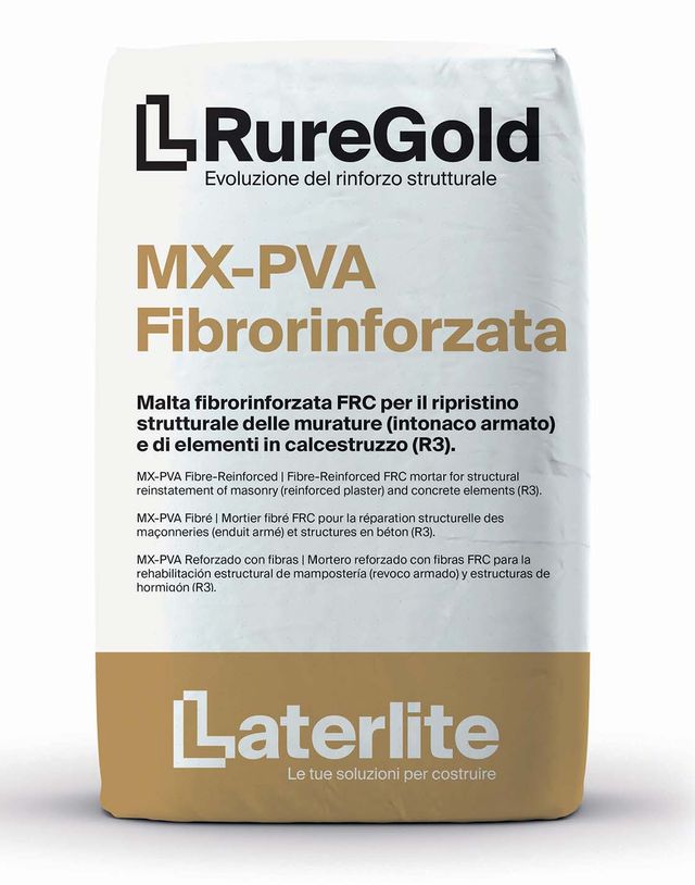 La soluzione tecnica prescelta per il consolidamento è la malta strutturale Mx-Pva Fibrorinforzata del sistema RureGold di Laterlite, un prodotto tixotropico fibrorinforzato formulato con cementi ad alta resistenza, aggregati selezionati e fibre in polivinil-alcol (Pva).